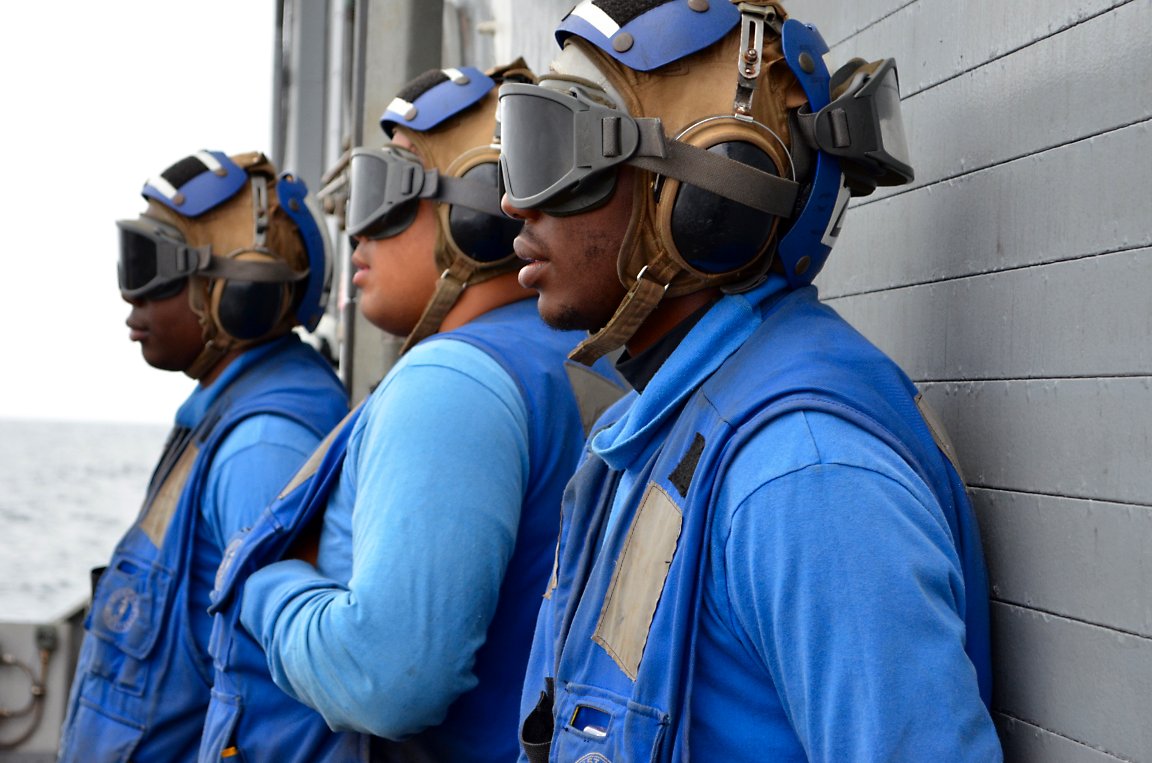 143k | 16 September 2014: at sea - From left, U.S. Navy Boatswain's Mate Seaman Robert Swanson, Seaman Apprentice Benedict Faolotoi and Seaman Jerron Cooke stand ready to receive a