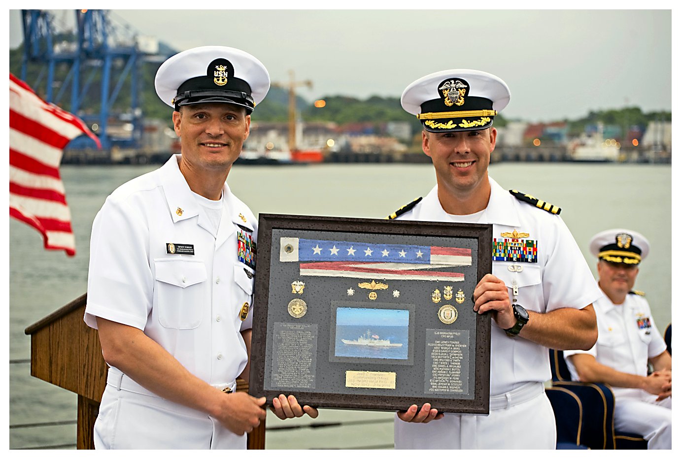 311k | 09 June 2014: Panama City, Panama - Commander Joey Frantzen is presented the USS Ingraham (FFG 61) commissioning pennant flown during his command of the ship. (U.S. Navy photo #140609-DSC2001 by STG2 Jeremy P. West from the Naval Surface Warriors - Flickr) | ||
