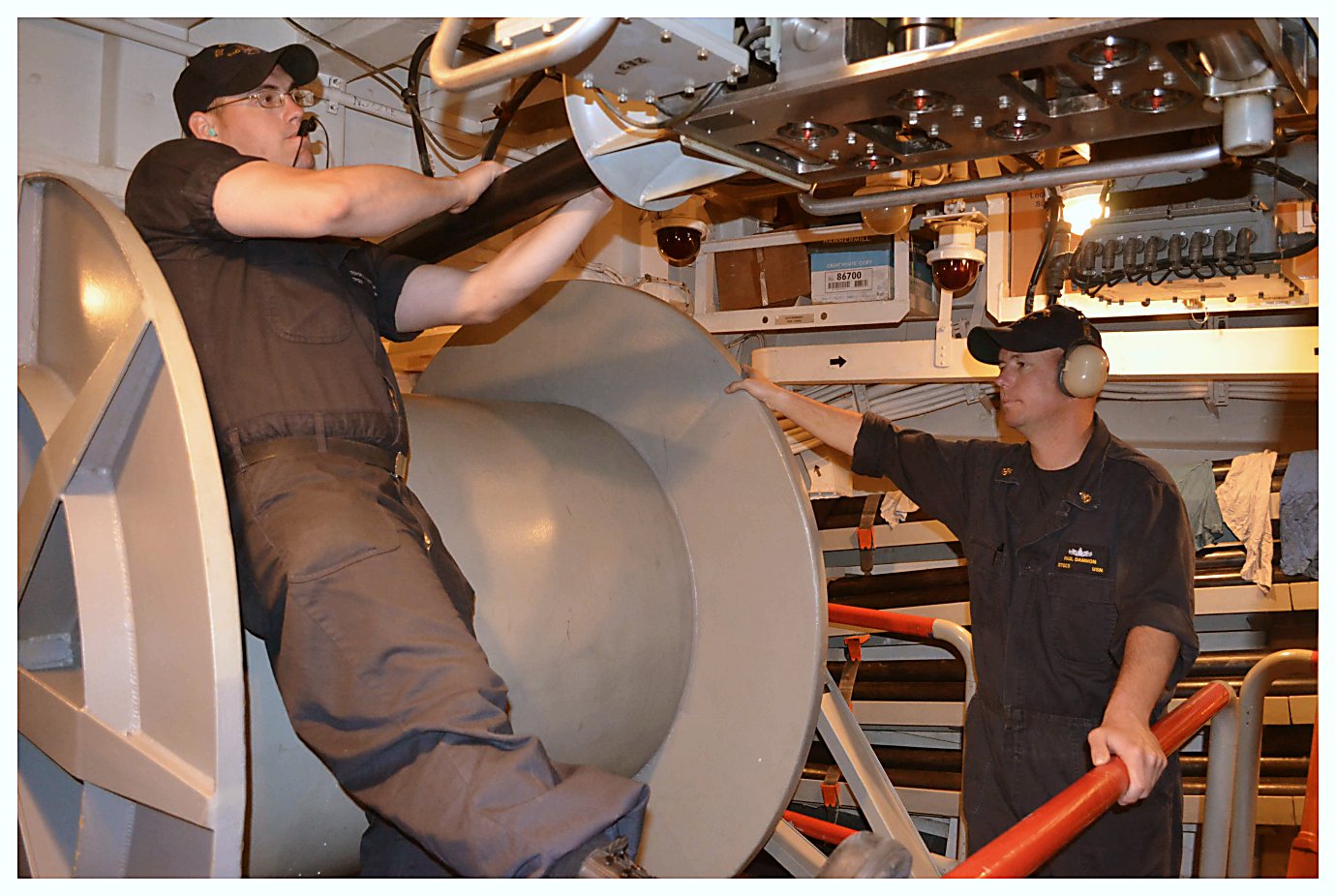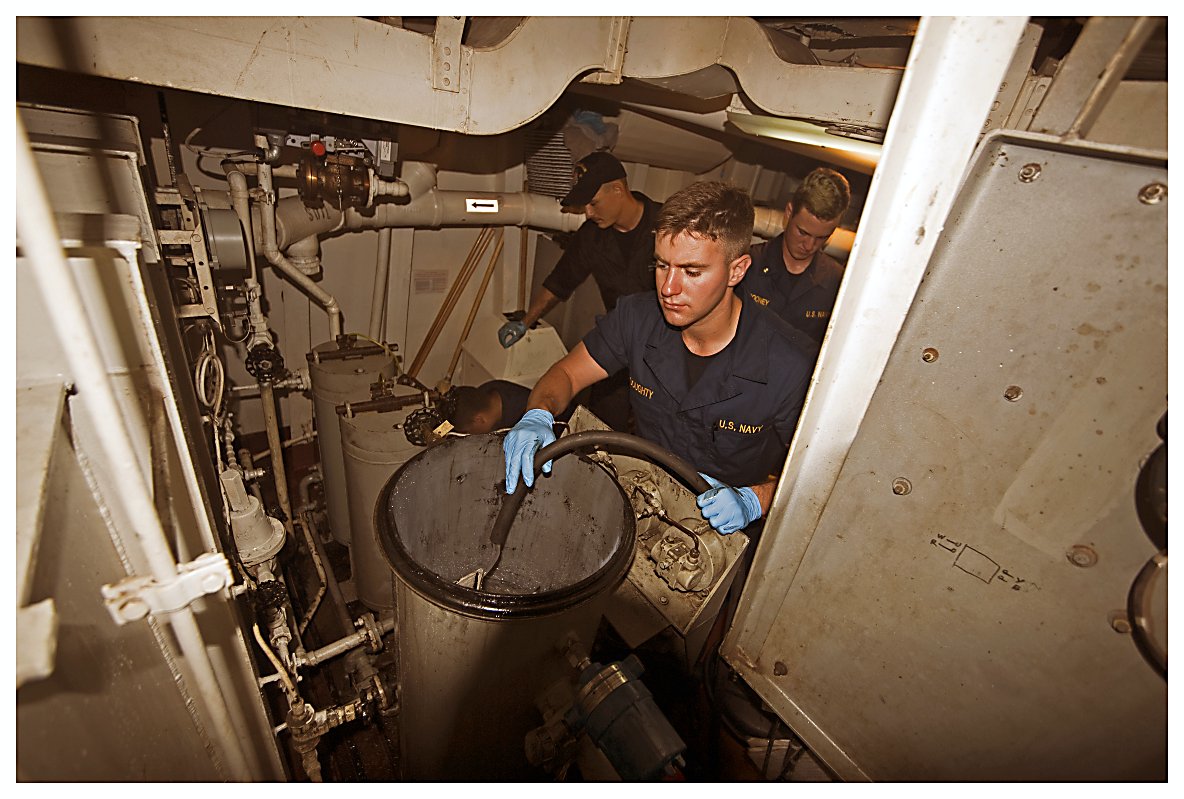 176k | 05 June 2014: USS Ingraham, at sea - In the foreground, Midshipman Thomas Doughty cleans the Oil Water Separator. (U.S. Navy photo #-DSC1712 by STG2 Jeremy P. West from the Naval Surface Warriors - Flickr) | ||