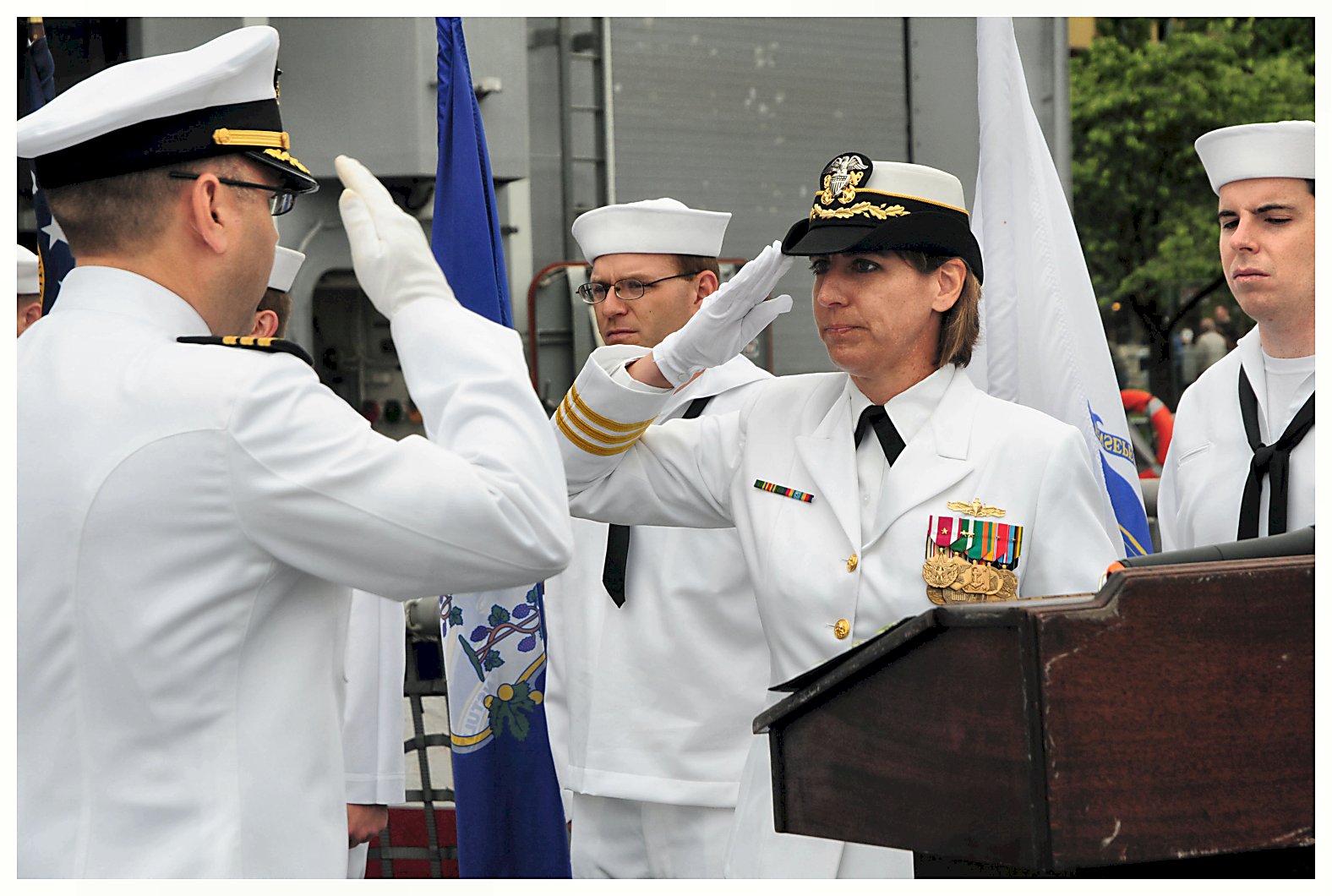 224k | 10 June 2011: Portland, Ore. - Commander Kristin Stengel (right) relieves Commander Adam Welter as the commanding officer of Oliver Hazard Perry-class frigate USS Ingraham (FFG 61) during a change of command held in Portland, Ore. today. Ingraham and her crew are in Portland, Ore. for the 104th annual Rose Festival. (U.S. Navy photo #110610-N-QM098-001 by MCC (SW/AW) Terry L. Feeney from the Commander, U.S. Third Fleet - Flickr) | ||