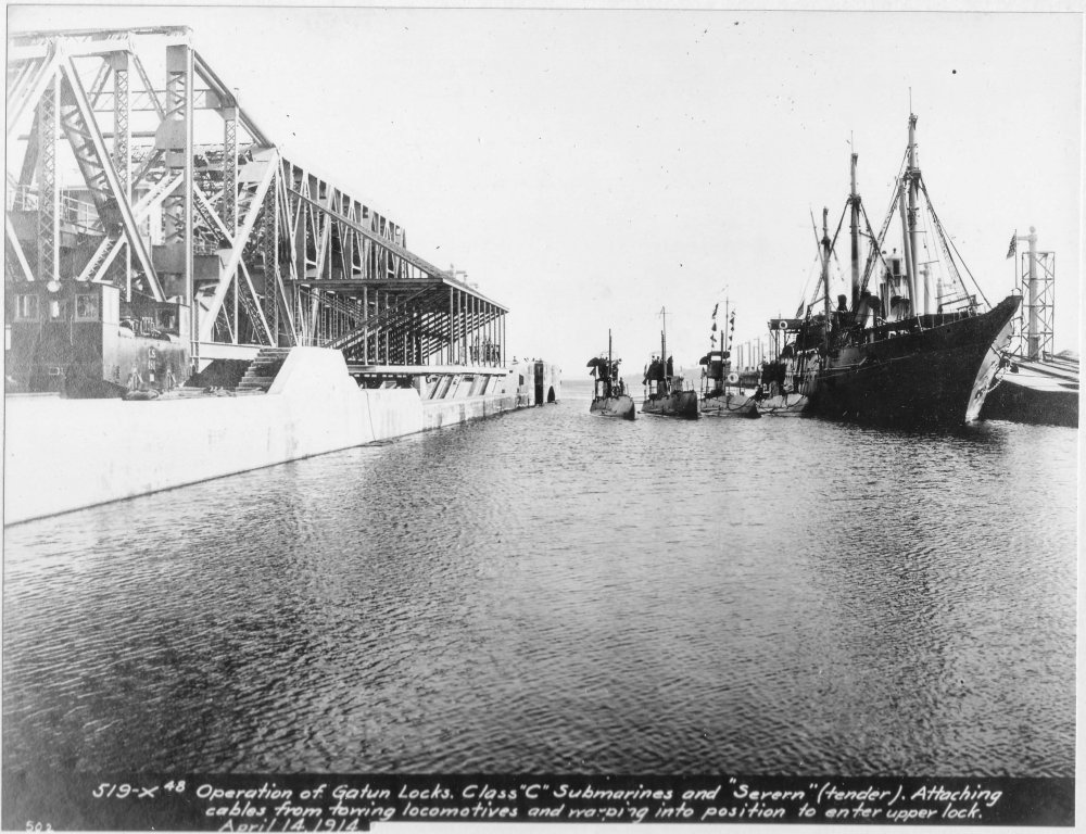 884k | Operation of the Gatun Locks. Class C submarines (Severn) (tender) in upper east chamber. (Severn) being towed by locomotives, submarines under own power. 15 April 1914. | Photo by Ernest Hallen, from the digital collection of Ron Armstrong, author of The Panama Canal, the Invisible Wonder of the World | |