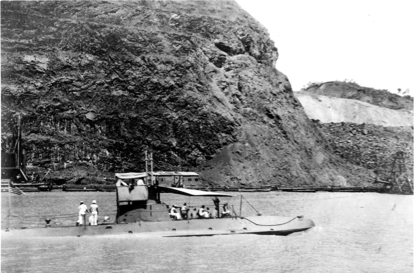 567k | SUBMARINES AT COLON FOR DEFENSE OF CANAL Four of the five submarines which, accompanied by a collier and the monitor Montauk, made the record breaking voyage from Guantanamo, Cuba, to Colon, Panama, where they are now anchored at the new concrete docks,waiting to pass through the canal. They will be used in the defense of the Pacific entrance to the canal. This is the first time that submarines have made such a long sea voyage. | Image and text provided by Arizona State Library, Archives and Public Records; Phoenix, AZ Photo from Bisbee Daily Review. (Bisbee, Ariz.) 1901-1971, 04 January 1914, Image 6, via chroniclingamerica.loc.gov. | |