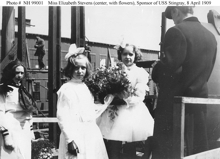 ![]() | 71k | The Stingray's (SS-13) Sponsor, Miss Elizabeth Stevens (center, holding flowers), with Miss Amanda Bayden, standing near Stingray's bow shortly before the christening, at the Fore River Shipyard, Quincy, Massachusetts, on 8 April 1909. At left is Miss Katherine E. Theiss, who christened Tarpon (SS-14) on the same day. | Collection of the Society of Sponsors of the United States Navy. Courtesy of the U.S. Naval Historical Center, Photograph # NH 99001. | |