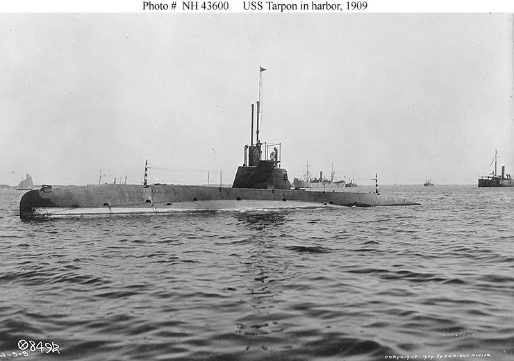![]() | 66k | Port side view of the Tarpon (SS-14). Photographed by Enrique Muller, 1909. The gunboat in the right distance is either Castine or Machias. | Courtesy of the U.S. Naval Historical Center, Photograph # NH 43600. | |