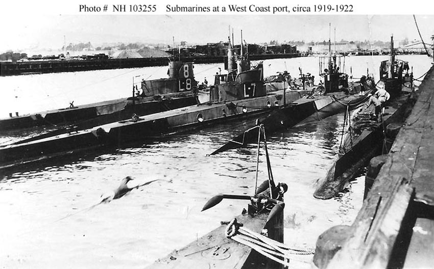 ![]() | 89k | Submarines at a West Coast port, circa 1919-1922. The Lake type L-8 (SS-48) is at the outboard (left) end of the nest, with her sister, L-7 (SS-46), in the middle (3rd from left). H-3 (SS-30) is between them, with another Electric Boat Company submarine second from right. The inboard (right) "boat" and that in the foreground are the other two units of the Lake-designed L-5 class; L-5 (SS-44) and L-6 (SS-45). Note the "Y-tube" hydrophone mounted on the bow of the submarine in the foreground. | USNHC photo # NH 103255. Collection of Chief Engineman Virgil Breland, USN. Donated by Mrs. E.H. Breland, 1979. | ||