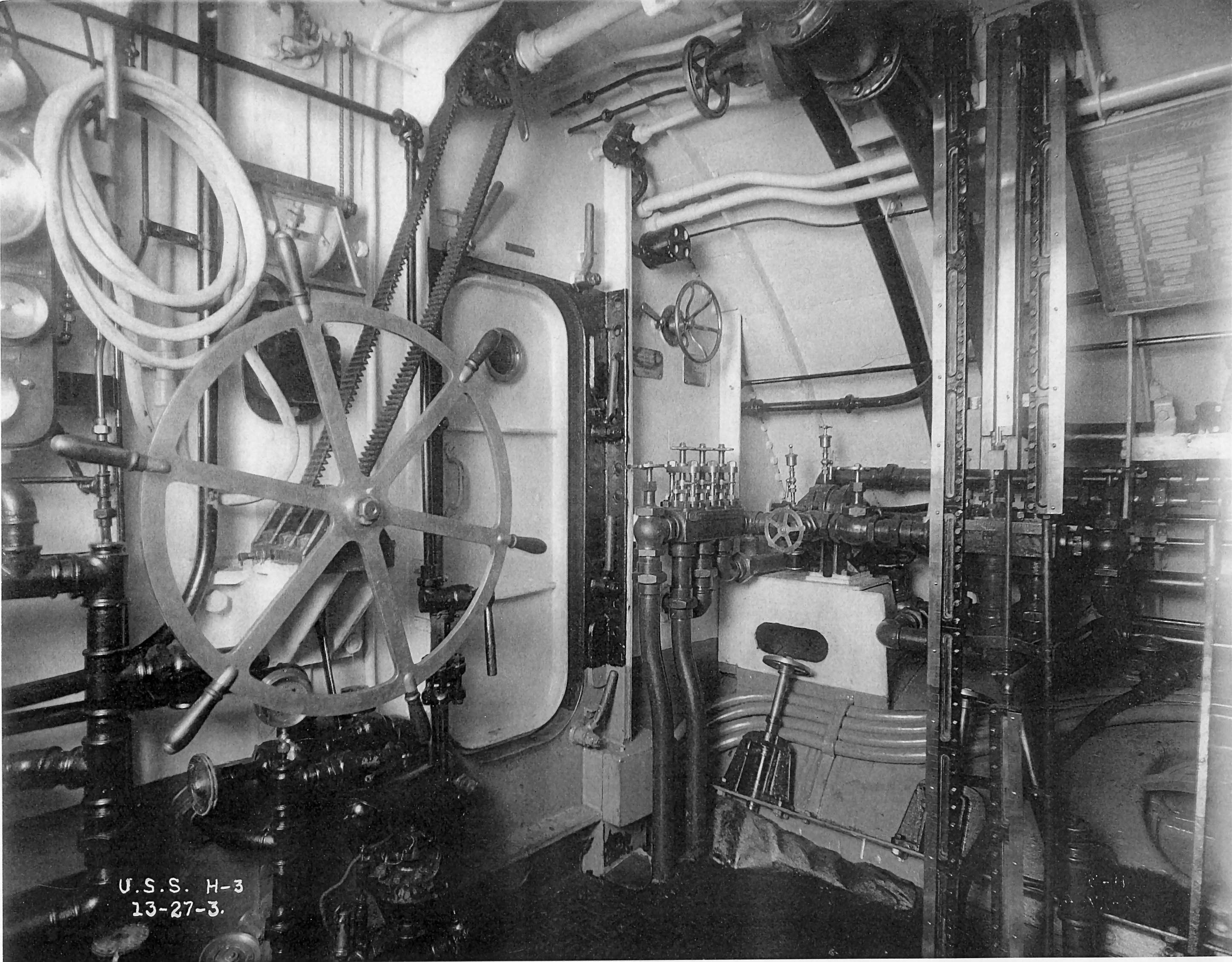 ![]() | 651k | Photo of the H-3 (SS-30) Control Room. The boat's wheel is connected via a metal "belt" to a shaft that runs though the boat in the overhead to the rudder. The vertical sight gauges show the fluid level in the variable ballast tanks below the deck. Date is 27 March 1913. The sub was still on the ways waiting for her 3 April 1913 launch. | US National Archives photo courtesy of Ric Hedman. | ||