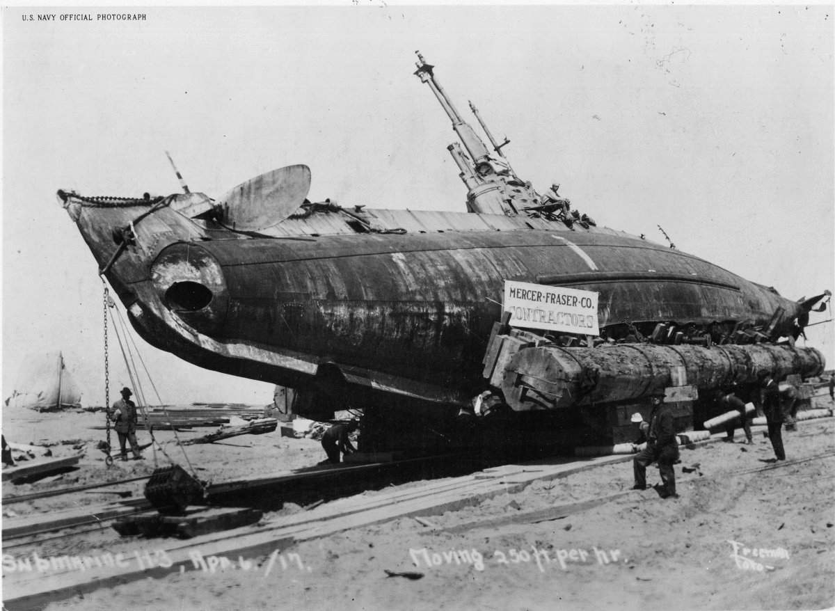 ![]() | 99k | The H-3 (SS-30) is shown being moved across the sand at Samoa Beach, CA on 6 April 1917 by Mercer-Fraser Co. The caption reads: Submarine H3, April 6/17, Moving 250 ft per hr. | USN photo courtesy of Darryl L. Baker. | ||