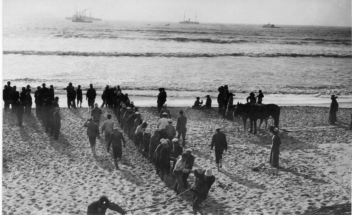 ![]() | 81k | A crowd has gathered on Samoa Beach, California to view the grounded submarine H-3 (SS-30) in late January 1917. | USN photo courtesy of Darryl L. Baker. | ||