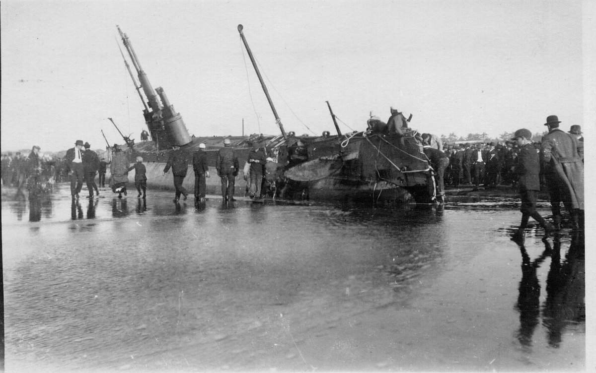 ![]() | 425k | SUBMARINE ASHORE ON ROCKS OFF SAN DIEGO, CAL. Another in the series of catastrophies that have occurred to the little American fleet of submersibles overtook them during a storm on the California coast. As mentioned above: Ran aground off Samoa , CA., 16 December 1916 and this photo is dated 10 February 1916. It may be possible that she ran aground here and then off Samoa later in the year (or not at all). The lack of the canvas bridge could be explained by having the photos being taken at different times. The temporary canvas bridges could be erected/taken down fairly quickly. I would imagine that the bridge was up at the time of the grounding, and was taken down prior to the attempt at refloating. | Photo i.d. courtesy of Ric Hedman & text by David Johnston Image and text provided by Penn State University Libraries; University Park, PA. Photo & text by Evening Public Ledger. (Philadelphia {Pa.]) 1914-1942, 10 February 1916, Night Extra, Image 20, courtesy of chroniclingamerica.loc.gov. | ||