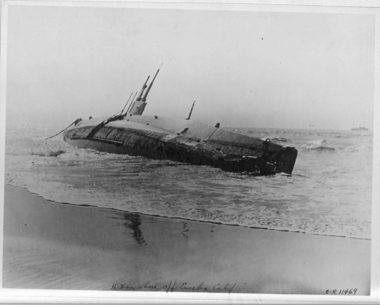 ![]() | 65k | The grounded submarine H-3 (SS-30) off Eureka, California. | USN photo # 19-N-11469, from (NARA), courtesy of Daniel Dunham. | ||