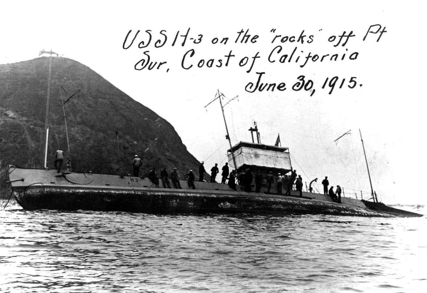 ![]() | 148k | The grounded submarine H-3 (SS-30) on the "rocks" off Pt. Sur, coast of California, 30 June 1915. | USN photo courtesy of ussubvetsofwwii.org. | ||