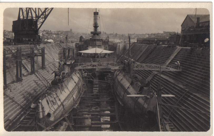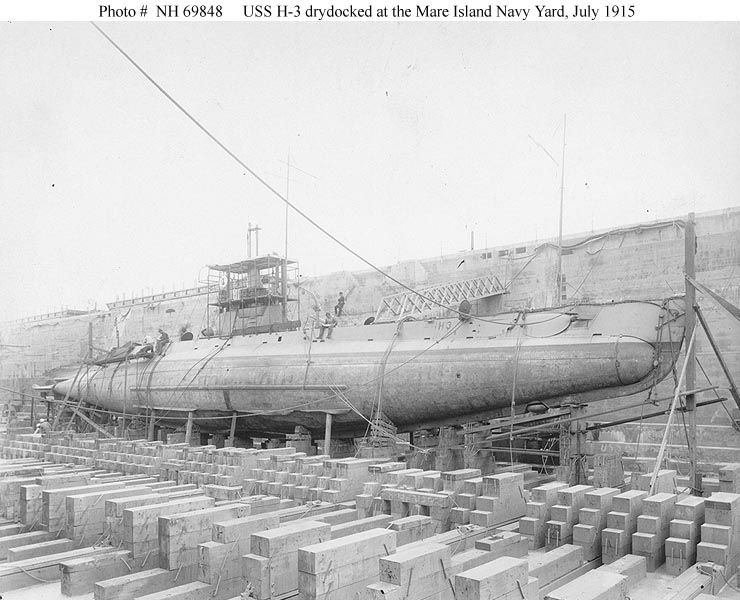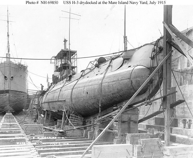 ![]() | 87k | The H-3 (SS-30) in drydock at the Mare Island Navy Yard, California, in July 1915. Her starboard bilge keel shows the effects of her recent grounding at Point Sur, California. | USNHC photo # NH 69848, courtesy of Donald M. McPherson, 1969. | ||