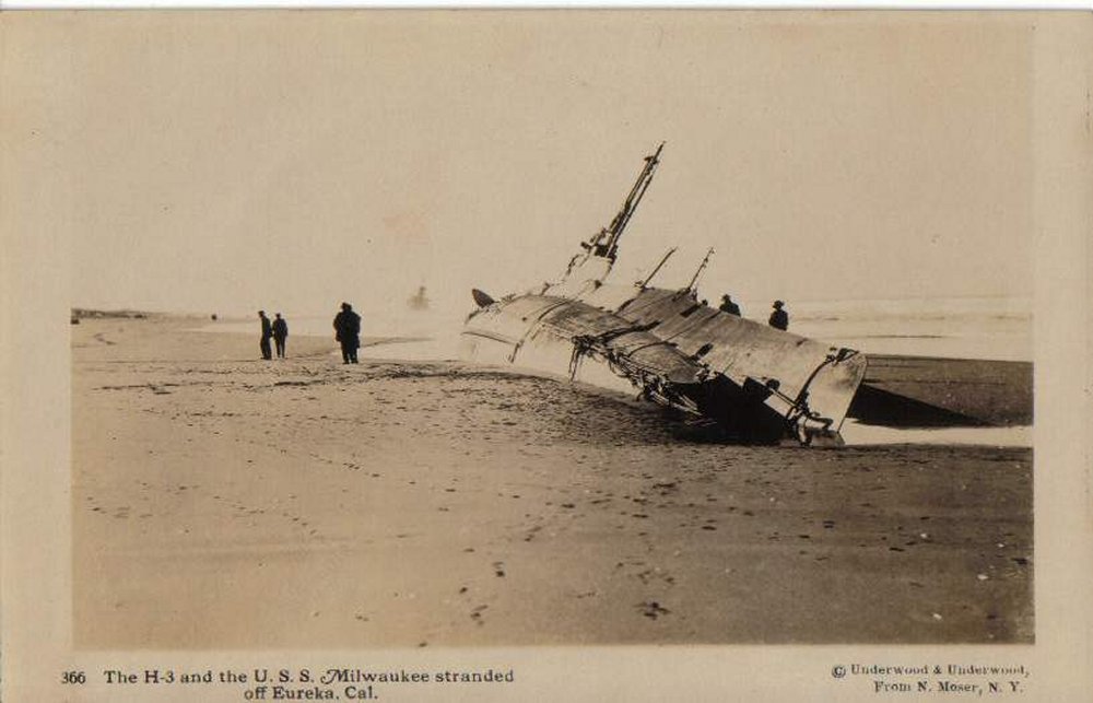 ![]() | 76k | H-3 (SS-30) stranded on Samoa Beach, near Eureka, California, during attempts to salvage her, circa 7-12 January 1917. Milwaukee (C-21) is visible at the left. | USNHC photograph # NH 53830 courtesy of Robert Hurst. | ||