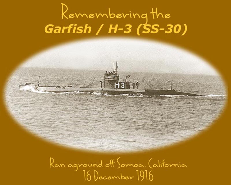 ![]() | 196k | Photo post card of the H-3 (SS-30), run aground at Samoa , CA., 16 December 1916. | Photo courtesy of Russ Wilson via Tom Bateman, formerly of George Washington (SSBN-598) and Blenny (SS-324) fame. | ||