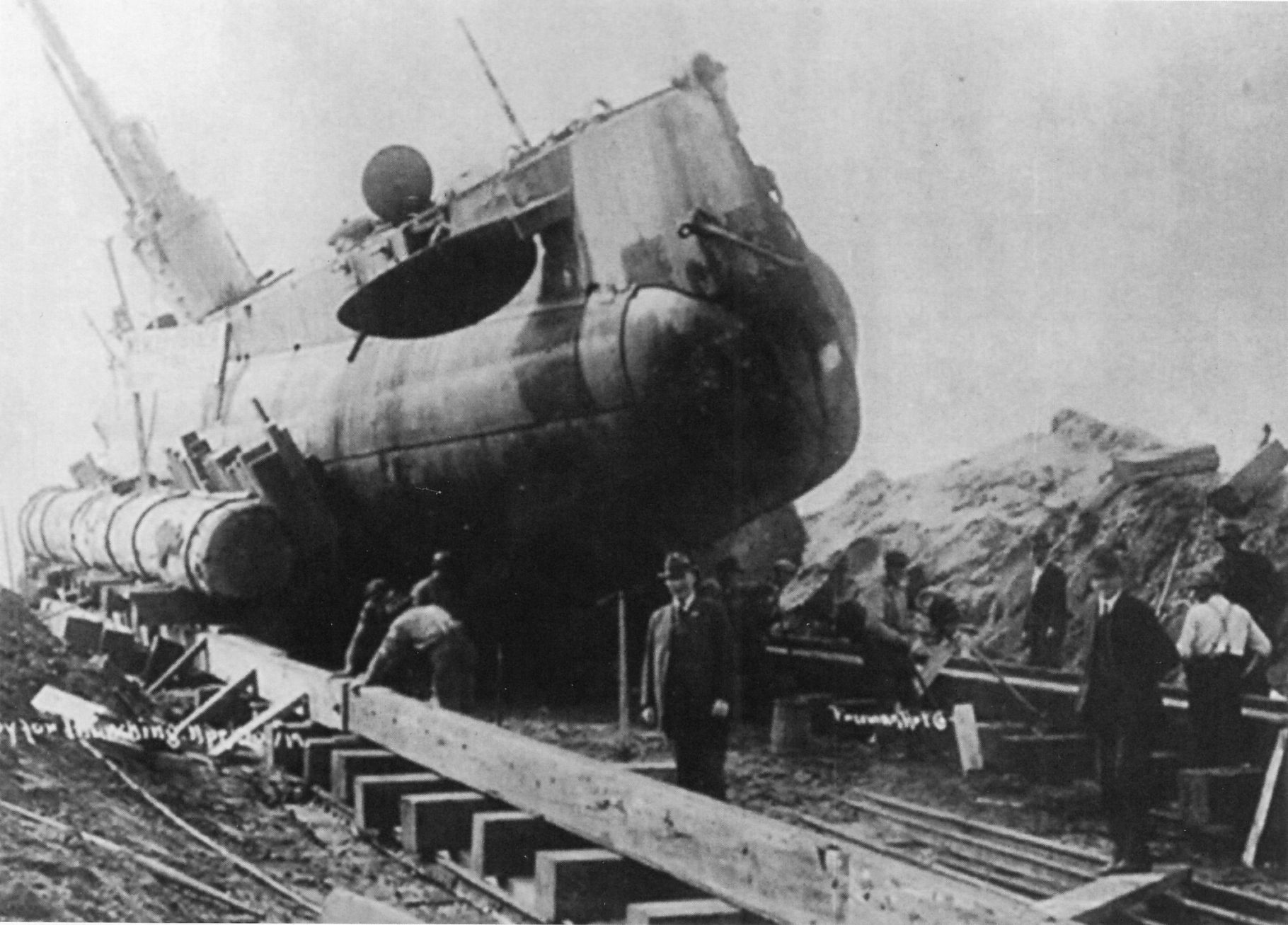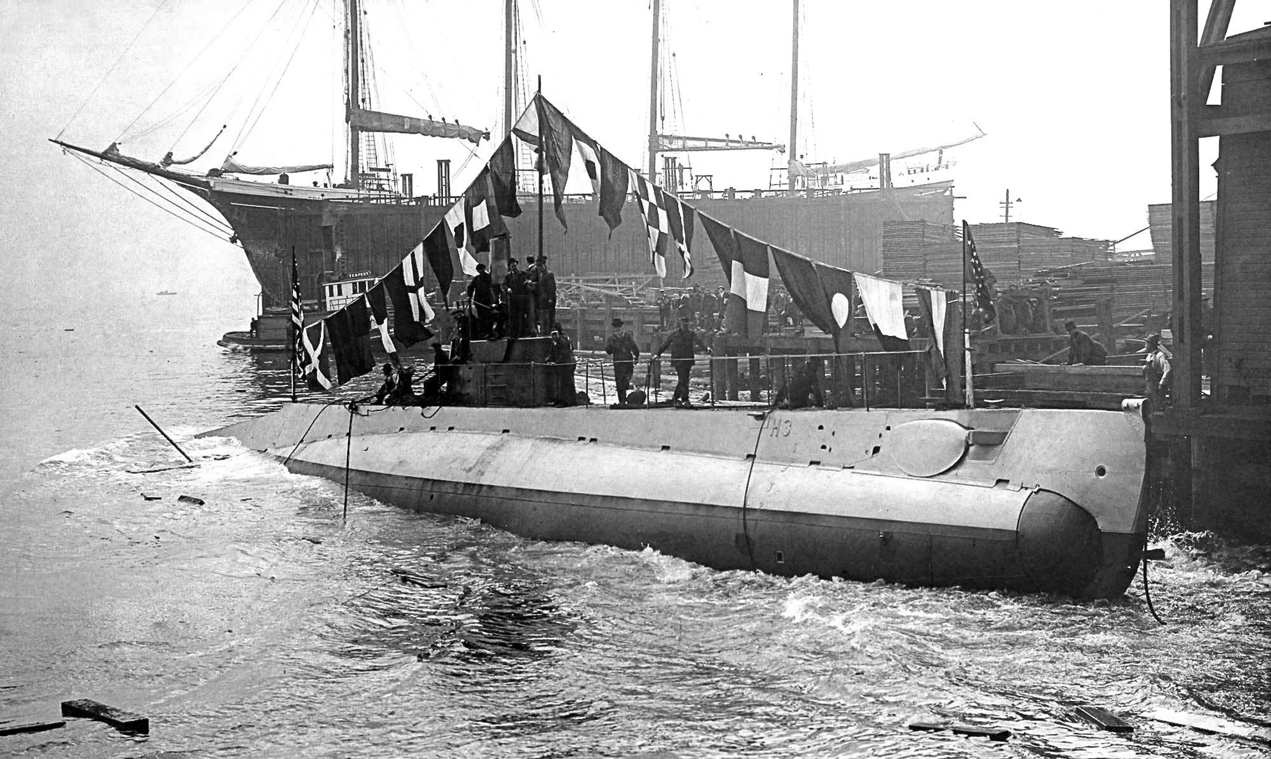 1.68k | H-3 (SS-30) launch. In contrast to the spartan attire of the F-boats at launch, the launch committee here found means to gaily dress this ship expansively in large international signal code flags. | Photo courtesy of Gary Mcintosh. Text courtesy of Seattle Post Intelligencer. 4 July 1913, courtesy of Beneath the Surface: World War I Submarines Built in Seattle and Vancouver by Bill Lightfoot. |
