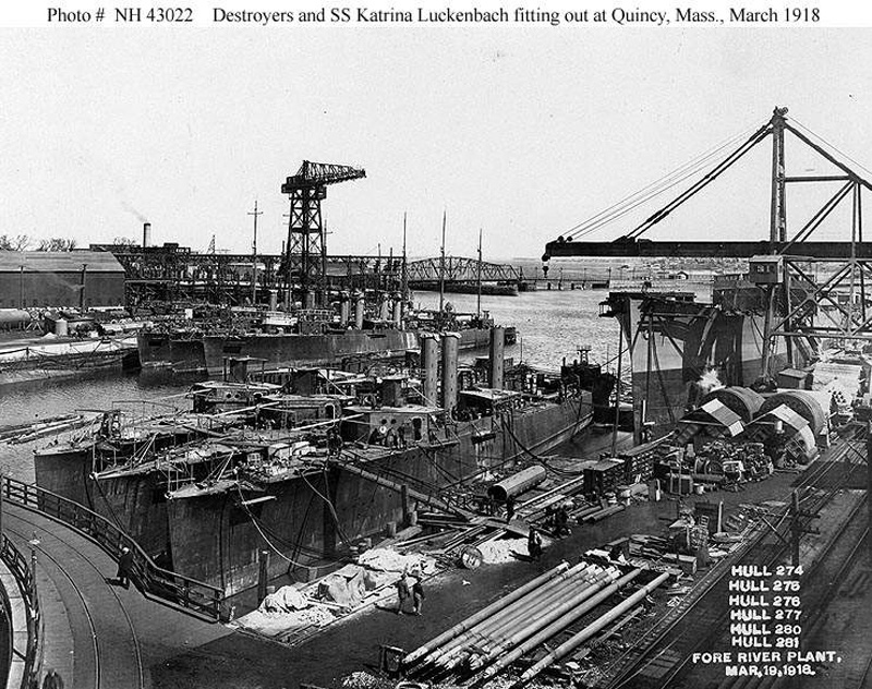 106k | Ships fitting out at the Fore River shipyard, 19 March 1918. The six destroyers are Little (DD-79), Kimberly (DD-80), Sigourney (DD-81), Gregory (DD-82), Colhoun (DD-85) and Stevens (DD-86), which had builder's hull numbers 274-277 and 280-281 respectively. The freighter at right is Katrina Luckenbach, yard hull # 267, which served as Katrina Luckenbach in 1918-19. Most of the equipment on the pier is for her. Note the large submarine being built in the background, under the revolving crane. It is probably S-1 (SS-105) or one of the AA-1 class: The AA-1 (SS-52), T-2 (SS-60) or T-3 (SS-61). |