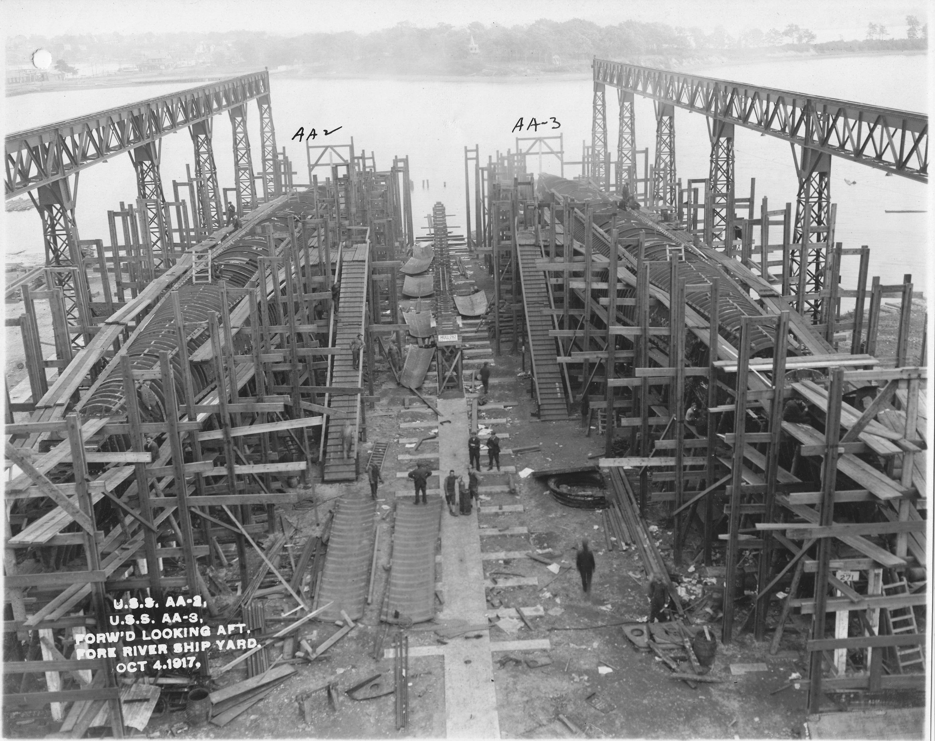 956k | AA-3 (SS-61) & AA-2 (SS-60), forward looking aft, Fore River Ship Yard, 4 October 1917. | US National Archives photo # 16lc 4 from NARA, College Park, Maryland, courtesy of Sean Hert. | |