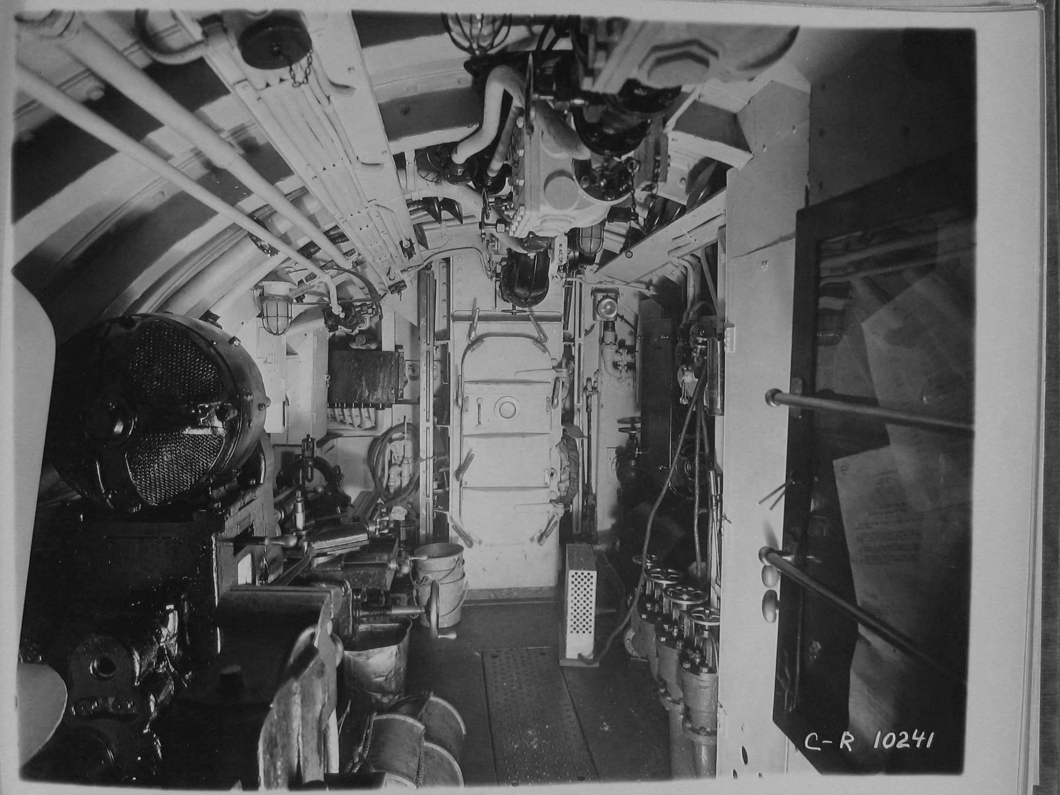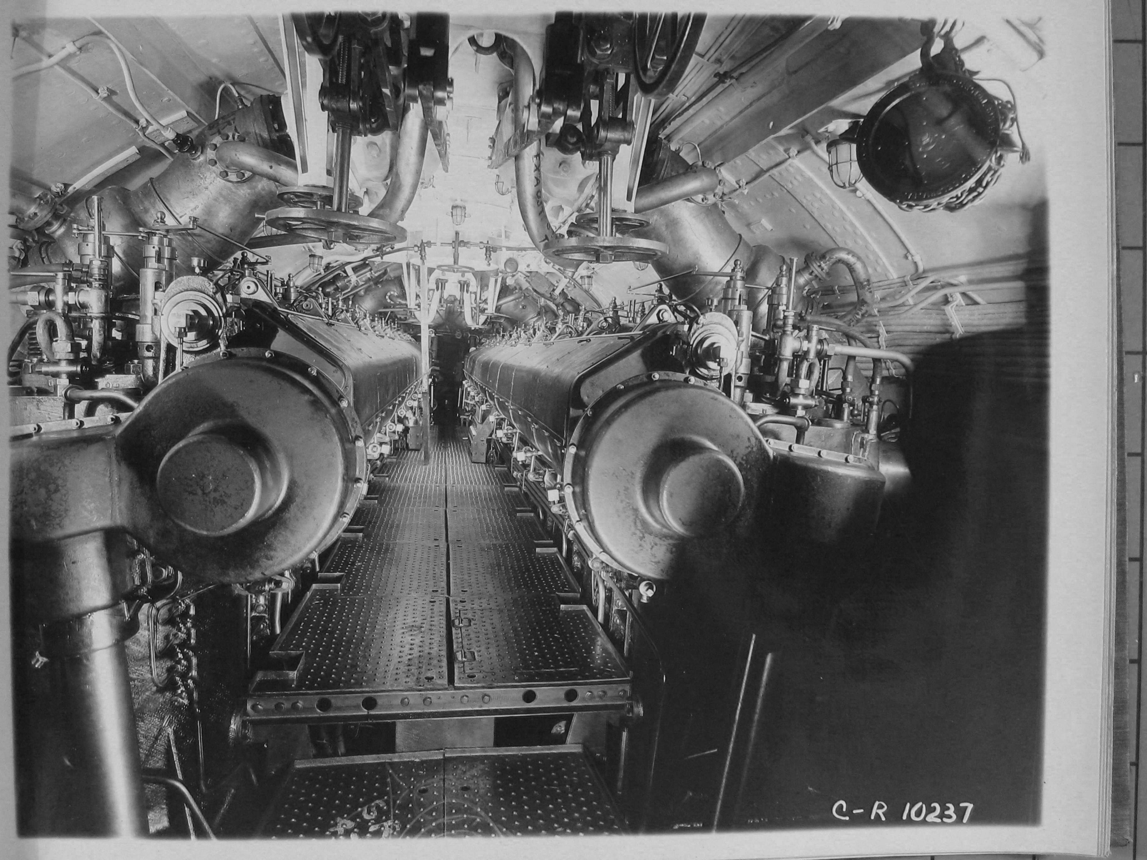 877k | Engine room, forward end looking aft. The large levers are clutches for the air compressors on each side and air start valve actuators for the engines. | Text i.d. courtesy of David Johnston & Ric Hedman. US National Archives photo C & R 10238 from NARA, College Park, Maryland, courtesy of Sean Hert. | |