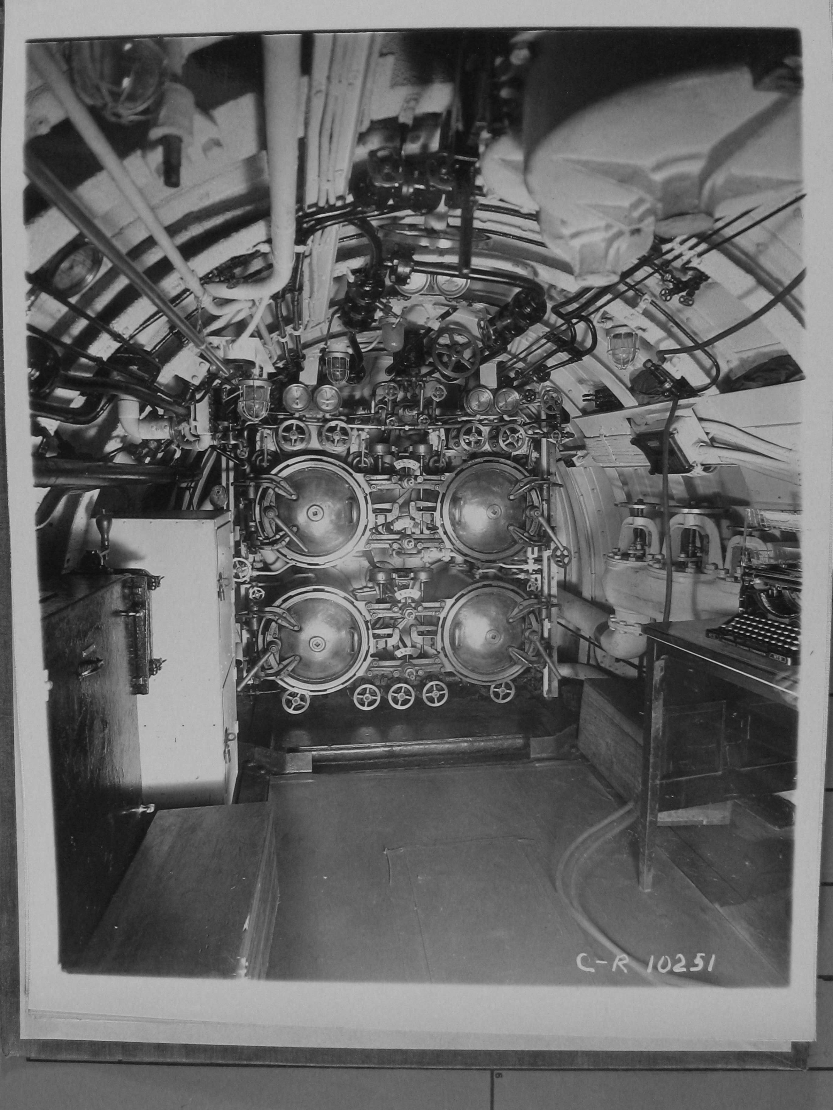 764k | Control room, middle of room, port side looking aft. On the left is the ships electrical switching panel. Two periscopes are visible in the center, and the watertight door to the engine room in the center. Visible on the right is the stern plane control wheel. | Text i.d. courtesy of David Johnston & Ric Hedman. US National Archives photo C & R 10249 from NARA, College Park, Maryland, courtesy of Sean Hert. | |