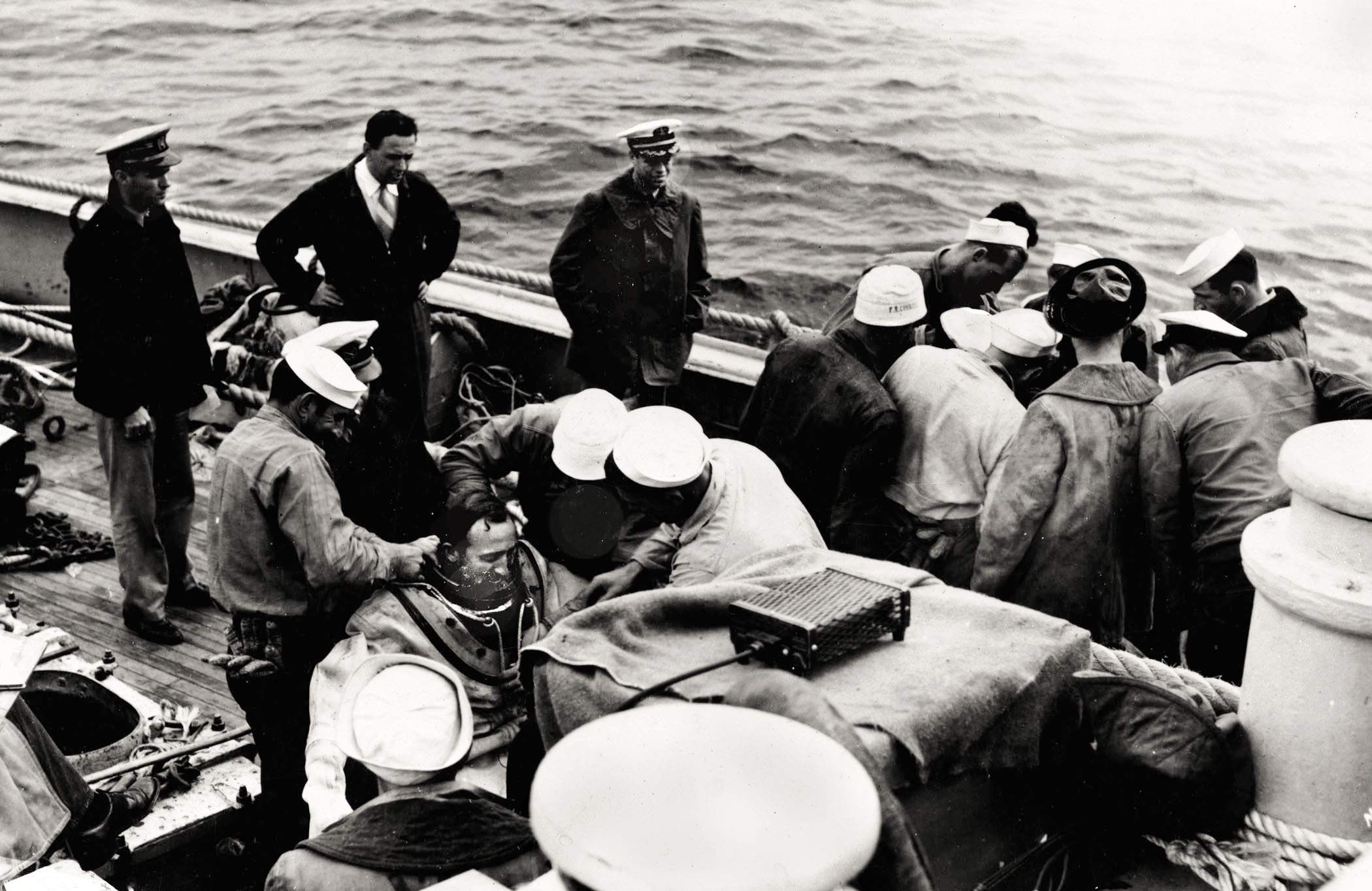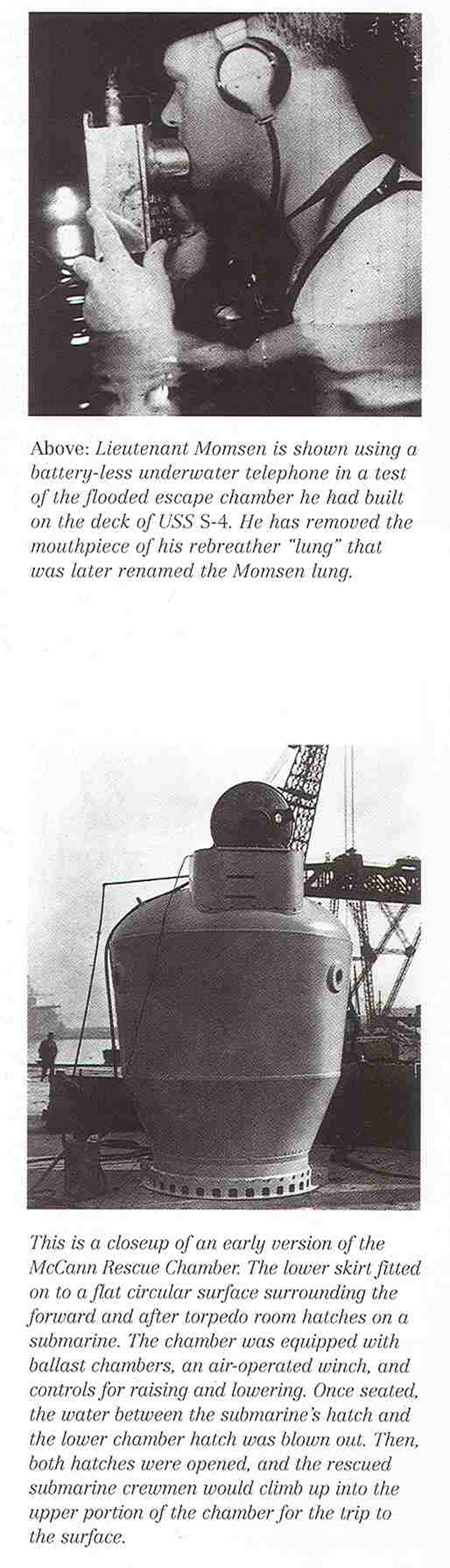 705k | Lieutenant Charles B. Momsen, USN, using a battery less underwater telephone in a test of the flooded escape chamber he had built on the deck of the S-4 (SS-109).... | USN photo courtesy of Scott Koen & ussnewyork.com. | |