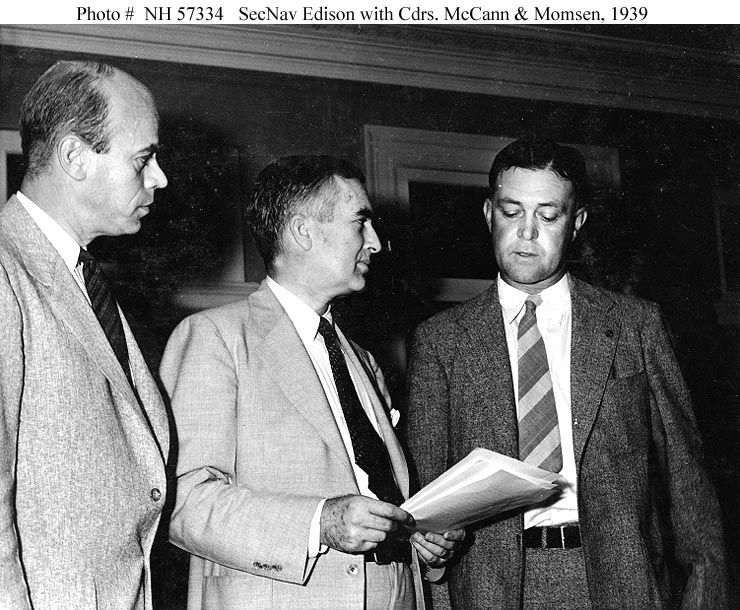 ![]() | 123k | Acting Secretary of the Navy Charles Edison (center) reads a Letter of Commendation from President Franklin D. Roosevelt to members of the Squalus (SS-192) salvage unit, in his Navy Department offices, 16 September 1939. Looking on are Commander Allan R. McCann, USN, (left) and Commander Charles B. Momsen, USN, (right). | Officia lUSN photo USNHC # NH 57334, from the collections of the Naval Historical Center. | |