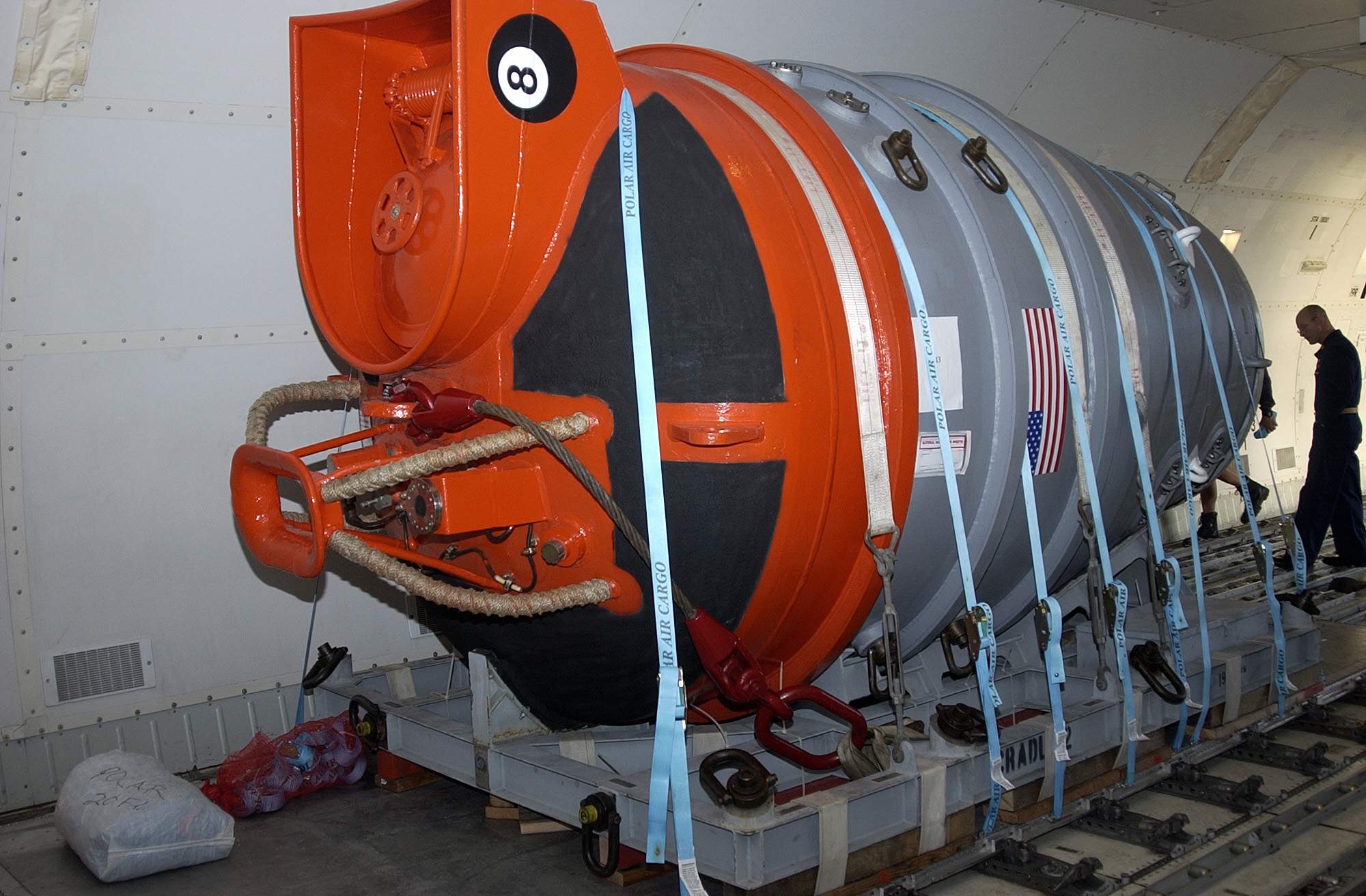 ![]() | 227k | The Navy's Deep Submergence Unit Submarine Rescue Chamber is preparing to be loaded on board a 747 aircraft at the Air Mobility Command (AMC) terminal. | USN photo # N-6426C-011 by Photographer's Mate 1st Class James Christopher, courtesy of chinfo.navy.mil. | |