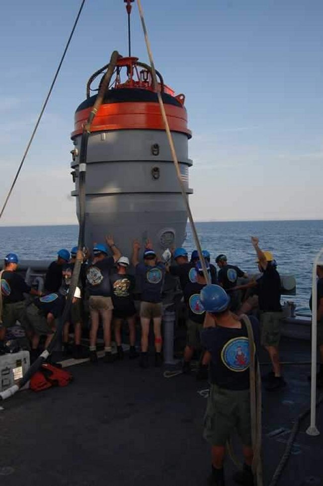 ![]() | 27k | Sailors aboard Grasp (ARS-51) ease the Submarine Rescue Chamber over the side on its way down to mate with the Spanish submarine Siroco. | USN photo courtesy of sorbetroyal2005.celex.net. | |
