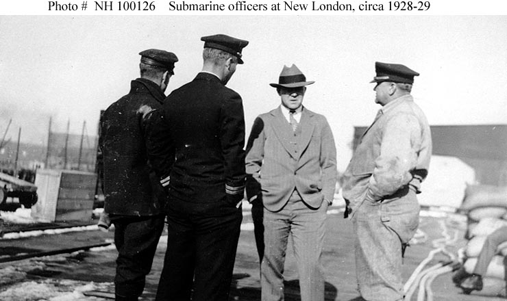co-developer of the submarine escape "lung" and of the submarine rescue chamber. Photographed at New London, Connecticut, circa the Winter of 1928-29. The four men are listed from left to right in this view. | Official USN photo # NH 100126, from the collections of the Naval Historical Center. Courtesy of Mr. Wallace Shugg, 1984. | |