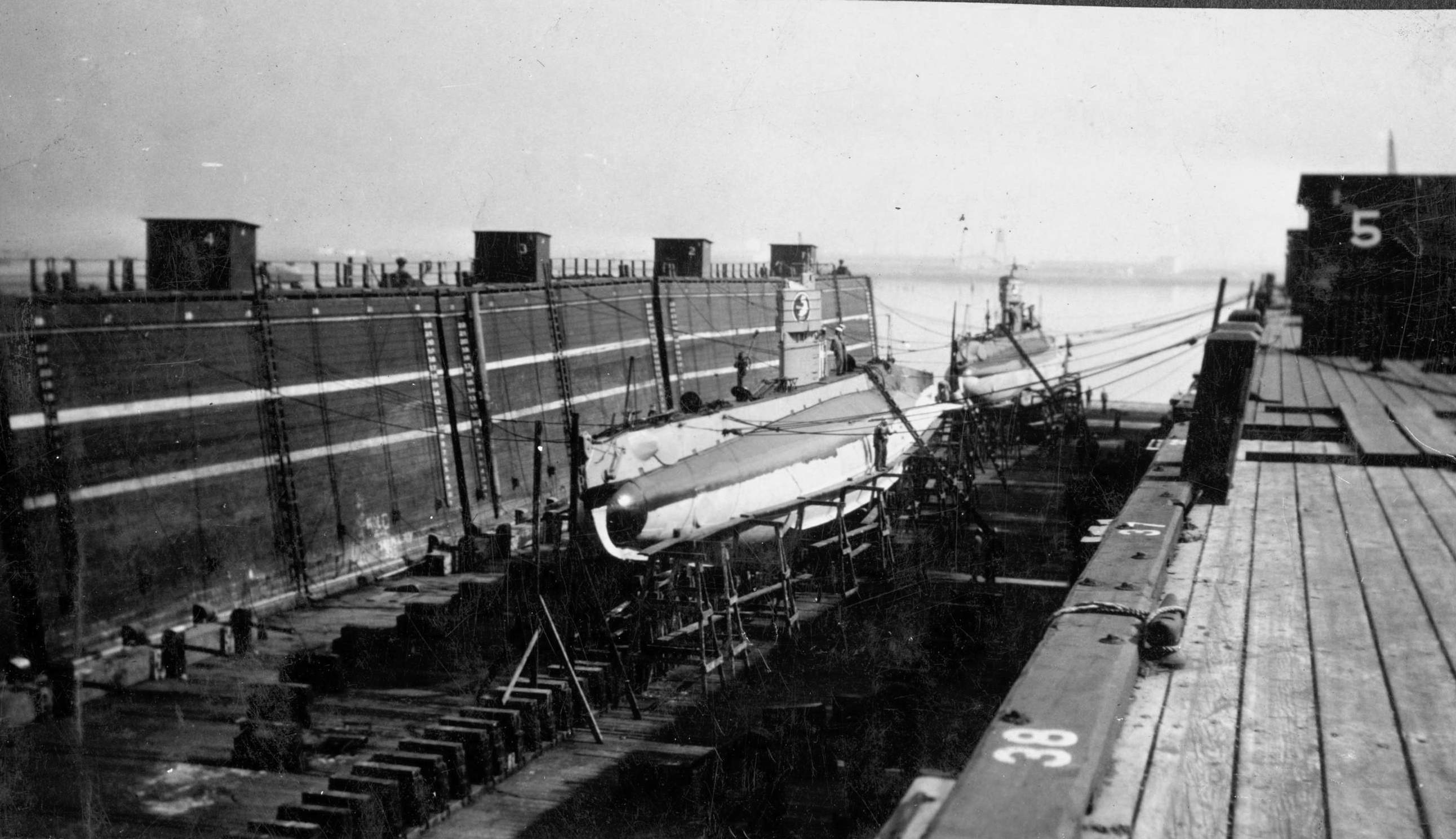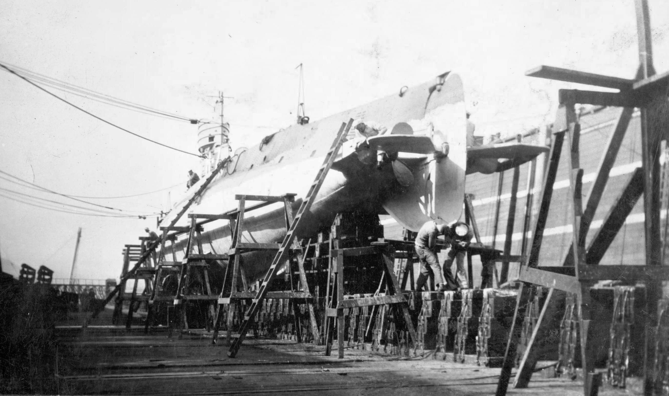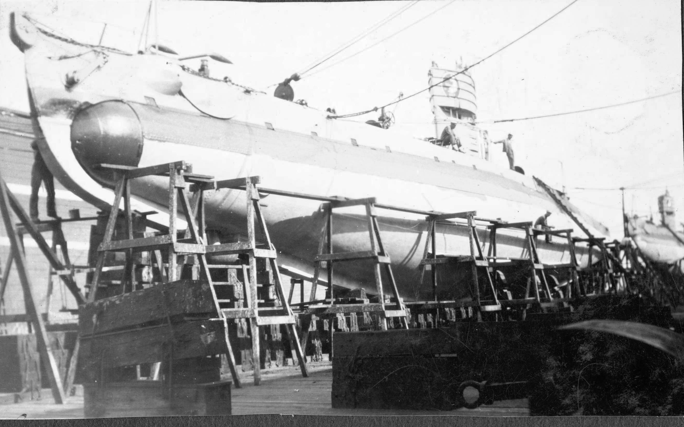 673k | H-boats in frame at Bremerton Naval Shipyard, approximately 23 May 1918. From the back right; H-4 (SS-147). In front is the H-5 (SS-148). To the left of the H-4 is the H-7 (SS-150). To the left of the H-5 is the H-6 (SS-149). H-8 (SS-151) and H-9 (SS-152) are not seen. Under the boom of the crane is the just about finished O-2 (SS-63), soon to be launched. | This is from a negative from the personal collection of Ric Hedman and acquired through Bill Lightfoot's research library, which he gave to me; he is the author of Beneath the Surface: World War I Submarines Built in Seattle and Vancouver. | |