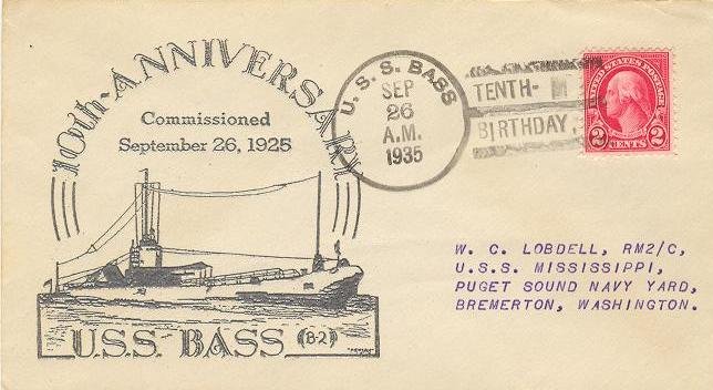 69k | Commemorative postal cover marking Bass's (SS-164) 10th anniversary commissioning, 26 September 1935. | Courtesy of Jack Treutle (of blessed memory). | |