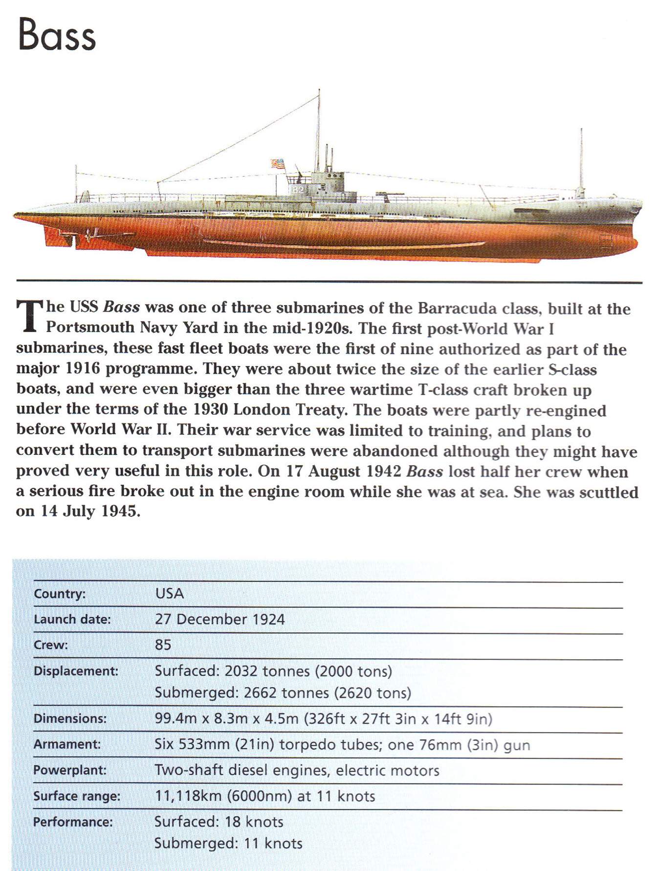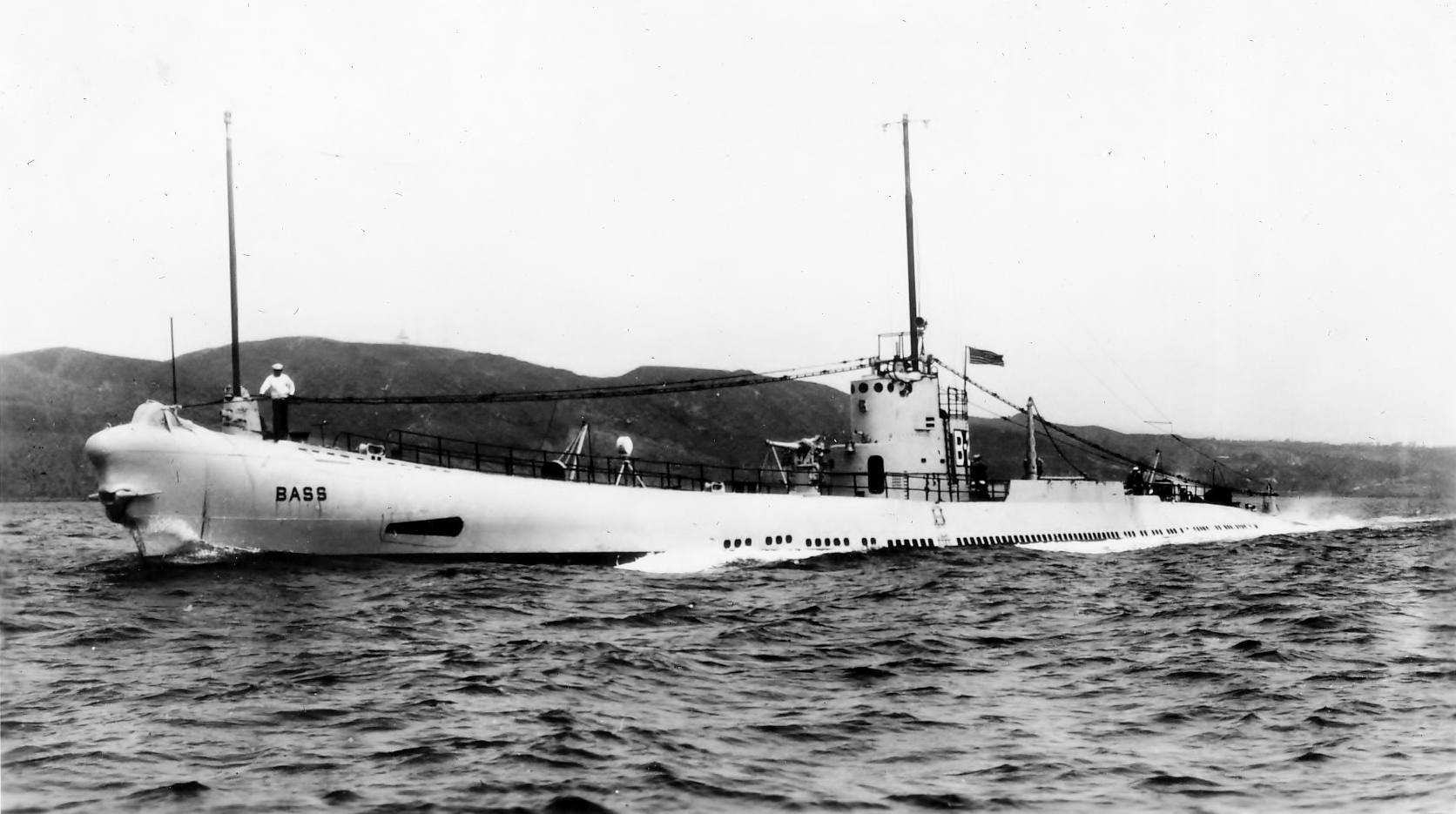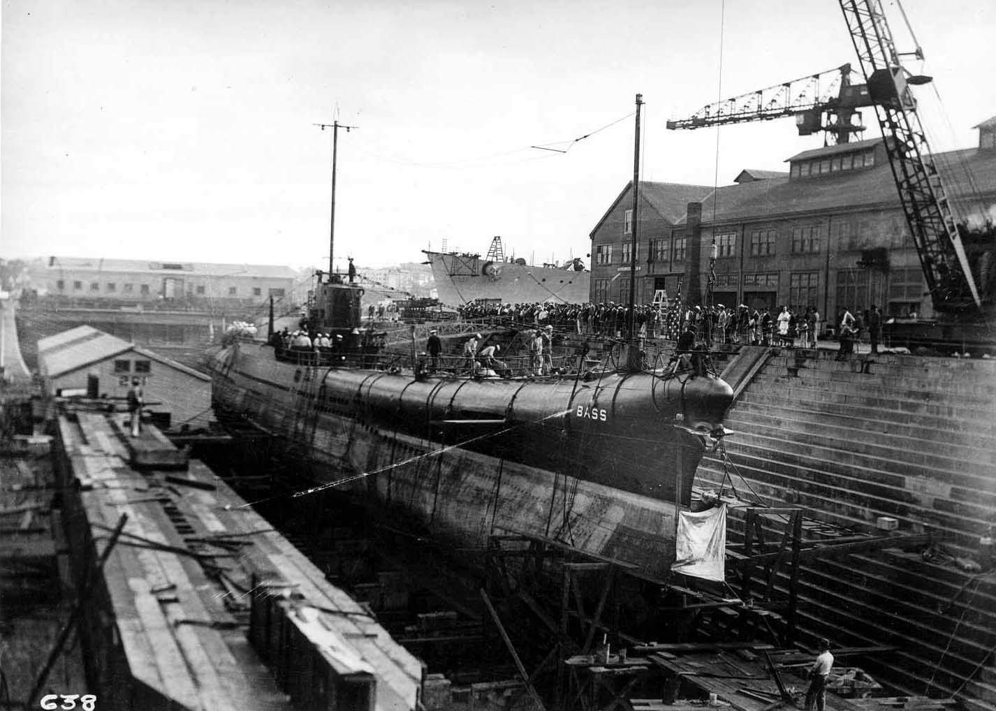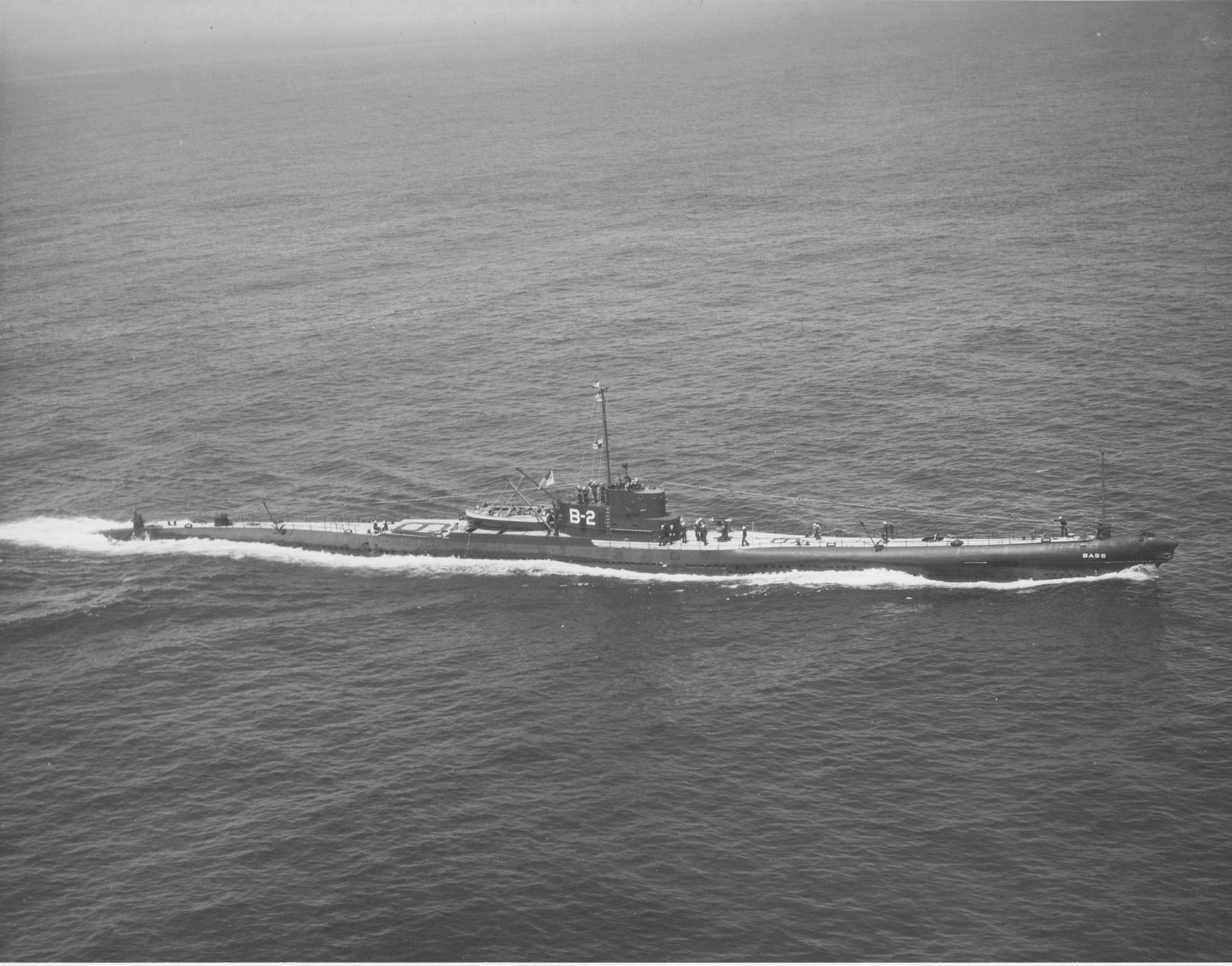 1.30k | Starboard side view of the Bass (SS-164), underway, 23 August 1935. Note the unusual raised deck section around and abaft the bridge fairwater. | Partial text courtesy of U.S. Submarines Through 1945, An Illustrated Design History by Norman Friedman. Naval Institute Press. USN photo # 80-G-463342 from NARA, College Park, Maryland, courtesy of Sean Hert. |