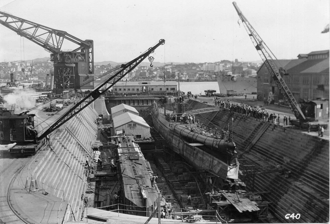 264k | Bass (SS-164) & Bonita (SS-165) are in Mare Island's dry dock one in May 1933. Bass is the to the left and of course Bonita is to the right. This is Bonita's 2nd docking during her overhaul thus her better paint job while this is Bass's first docking during her overhaul. They both undocked on 7 July 1933. Both re-docked on 18 July 1933 until 8 September 1933. | HABS No. CA-1543-BP-19., courtesy of Library of Congress via Darryl L. Baker. | |