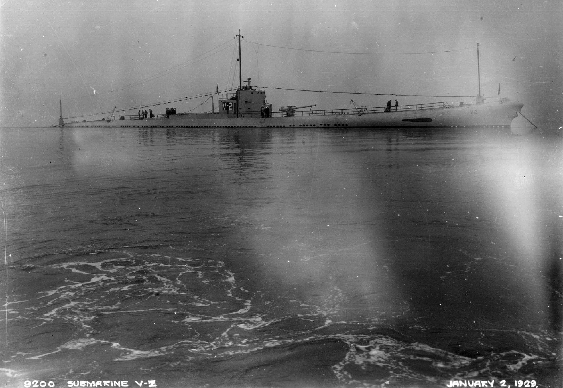 225k | Starboard side view of the V-2 (SS-164) on 2 January 1929 at anchor, probably on the West Coast. | USN photo courtesy of Darryl L. Baker. | |