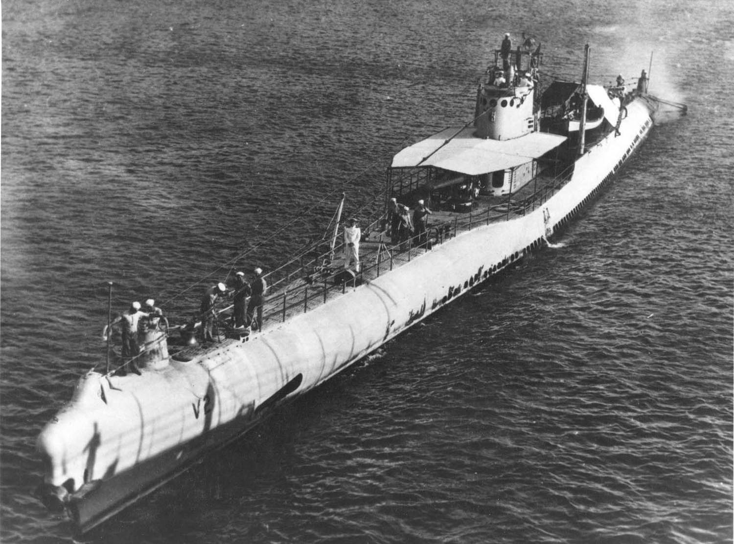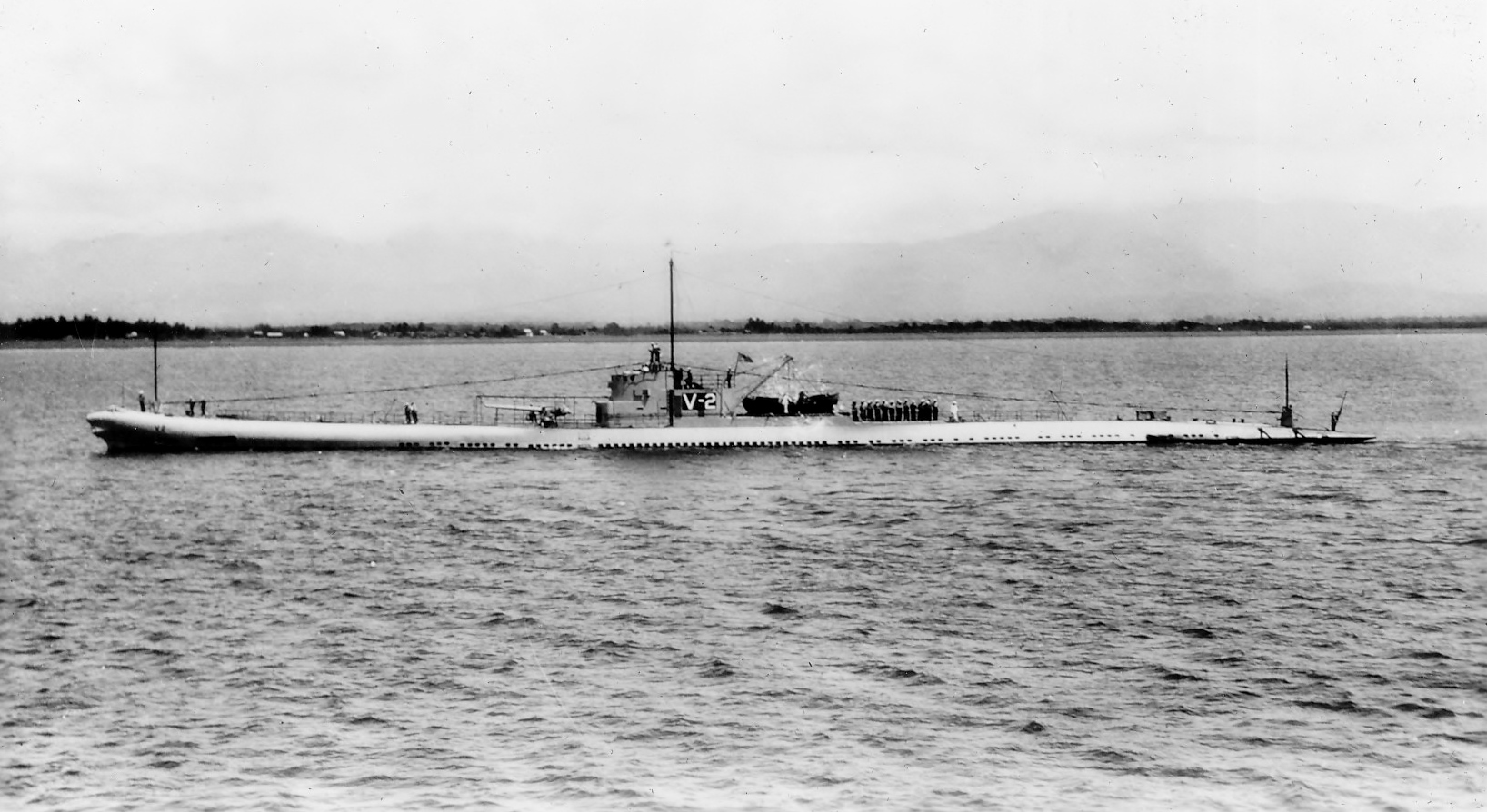 565k | Portside view of the V-2 (SS-164) underway, circa 1920's. Note small boat after the conning tower. | USN photo thanks to Jim Kurrasch @ Battleship Iowa, Pacific Battleship Center. | |