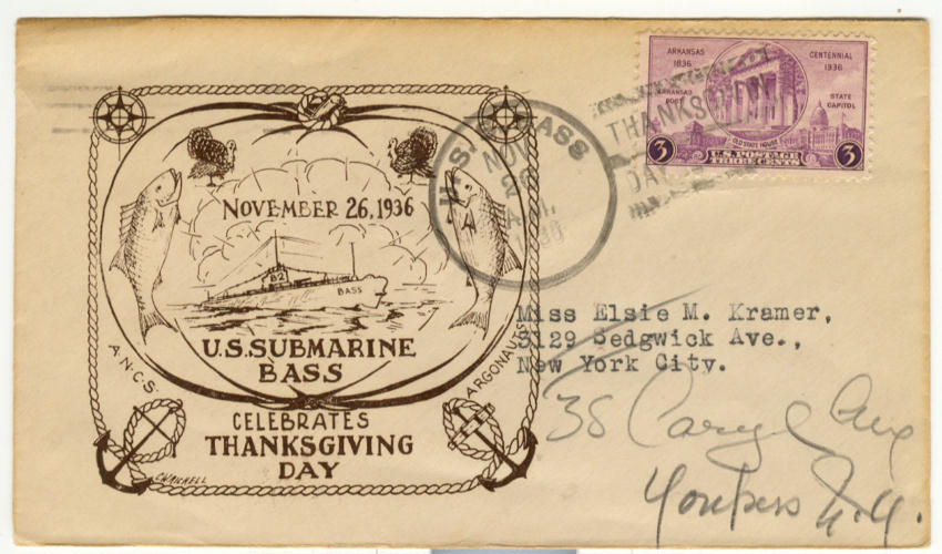 69k | Commemorative postal cover marking Thanksgiving Day on the Bass (SS-164), 26 November 1936. | Courtesy of Jack Treutle (of blessed memory). | |