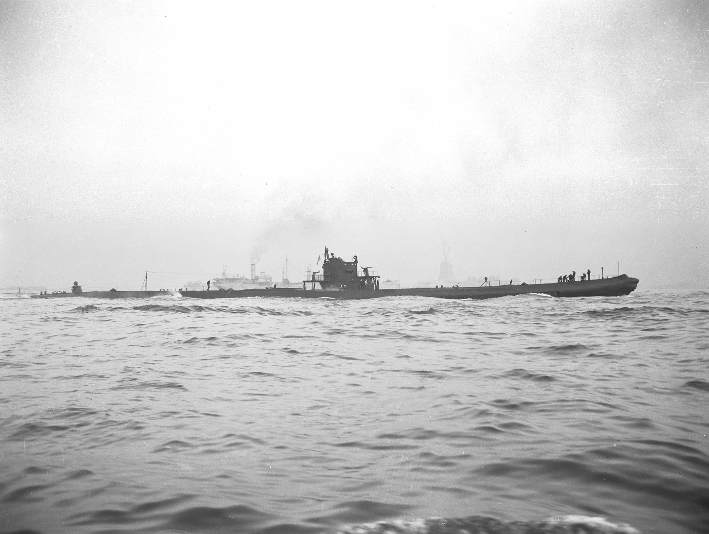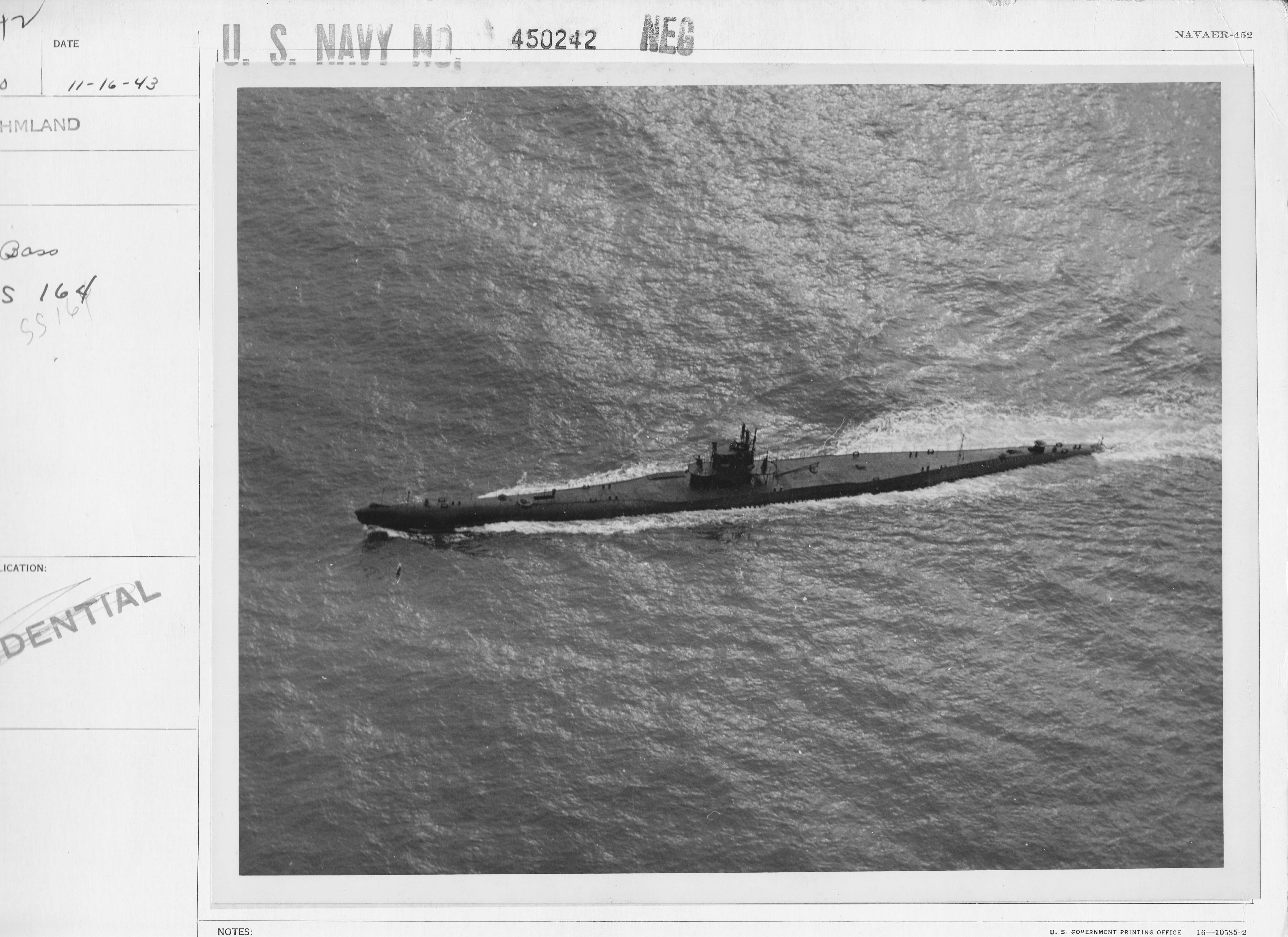1.10k | Bass (SS-164) remained in the Canal Zone until October 1942 when she departed for Philadelphia, arriving on the 19th. After undergoing repairs at Philadelphia Navy Yard Bass proceeded to New London, Conn., where she conducted secret experiments off Block Island in December 1943. She is seen here underway on 16 November 1943. |
