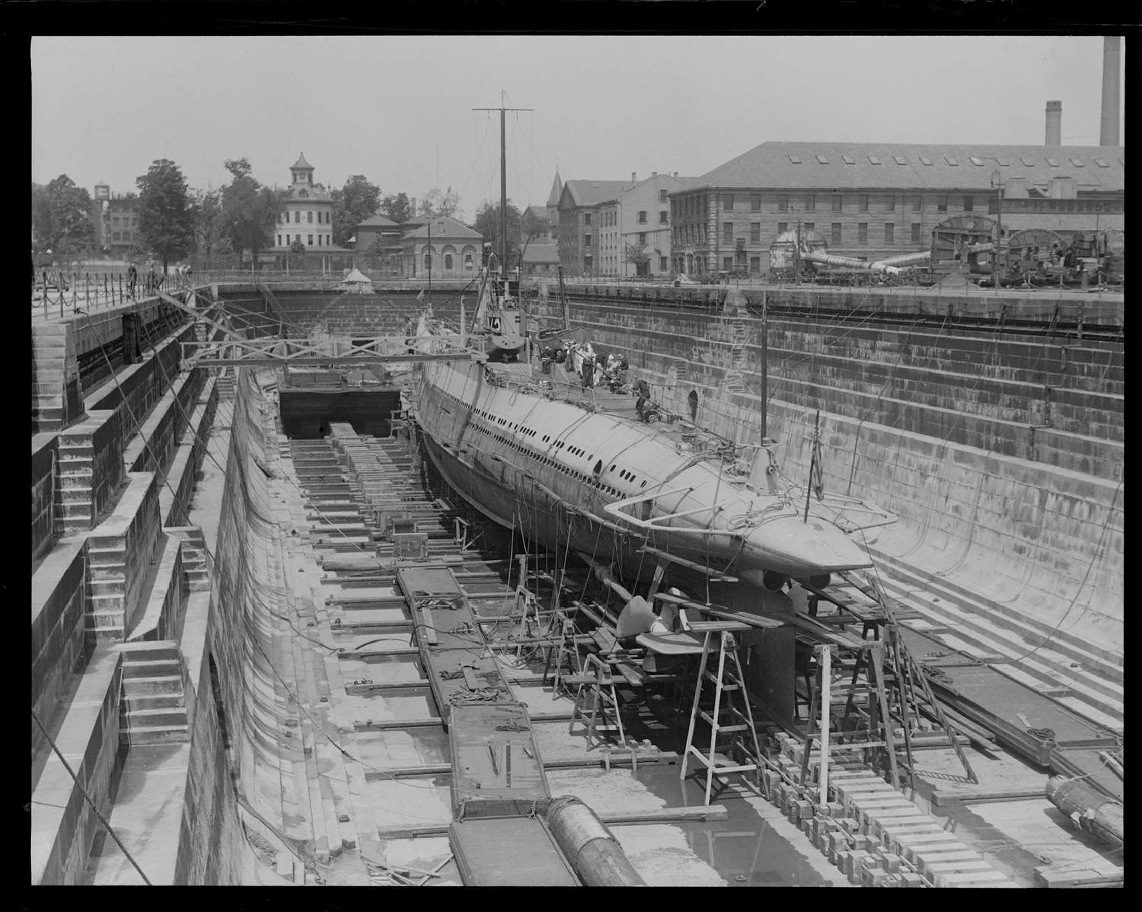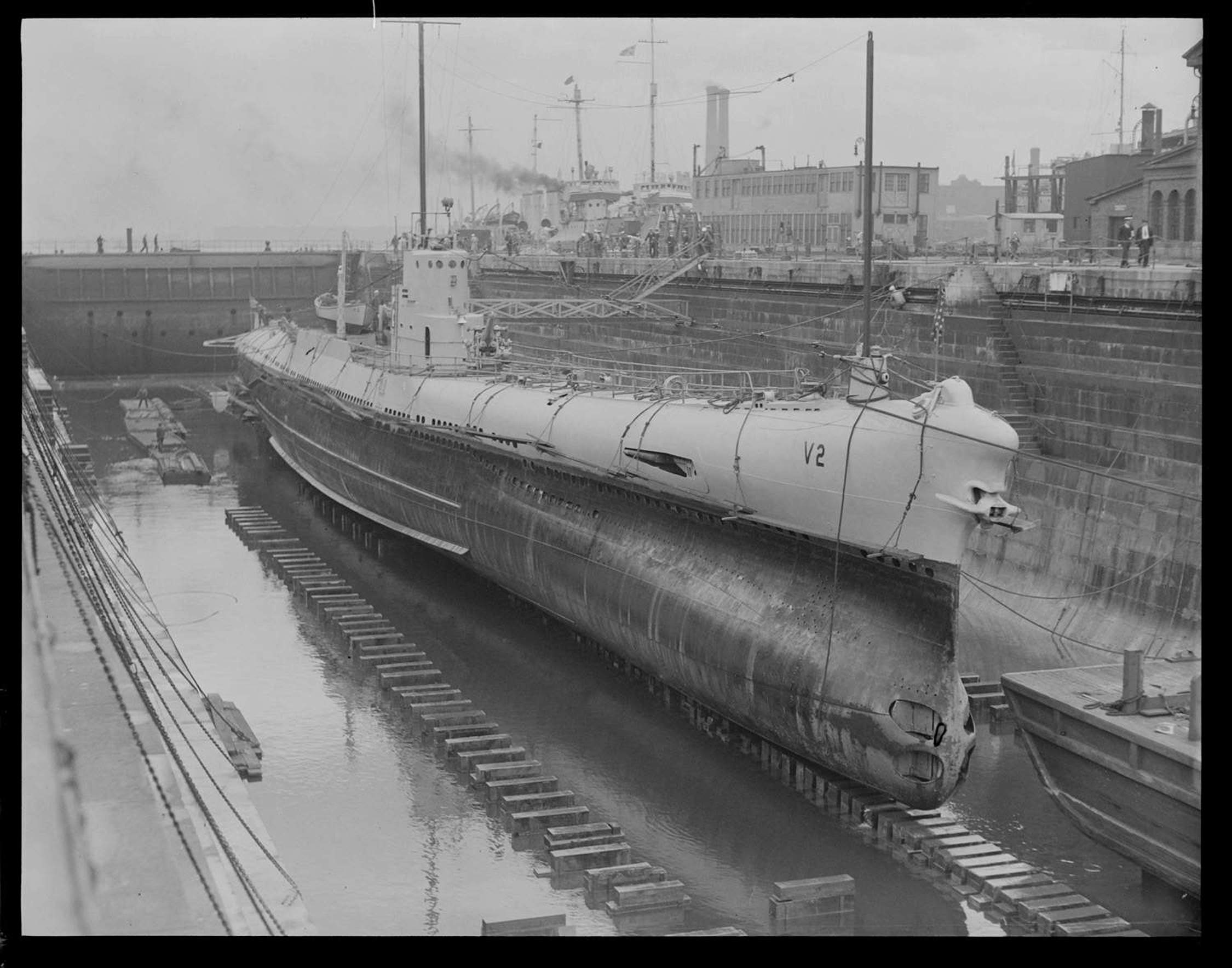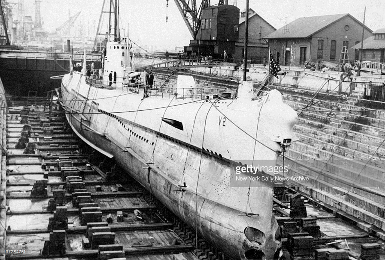 728k | V-2 (SS-164) overhauled in drydock at the Brooklyn Navy Yard. | Photo by Harry Warnecke/NY Daily News Archive via Getty Images courtesy of gettyimages.com. | |