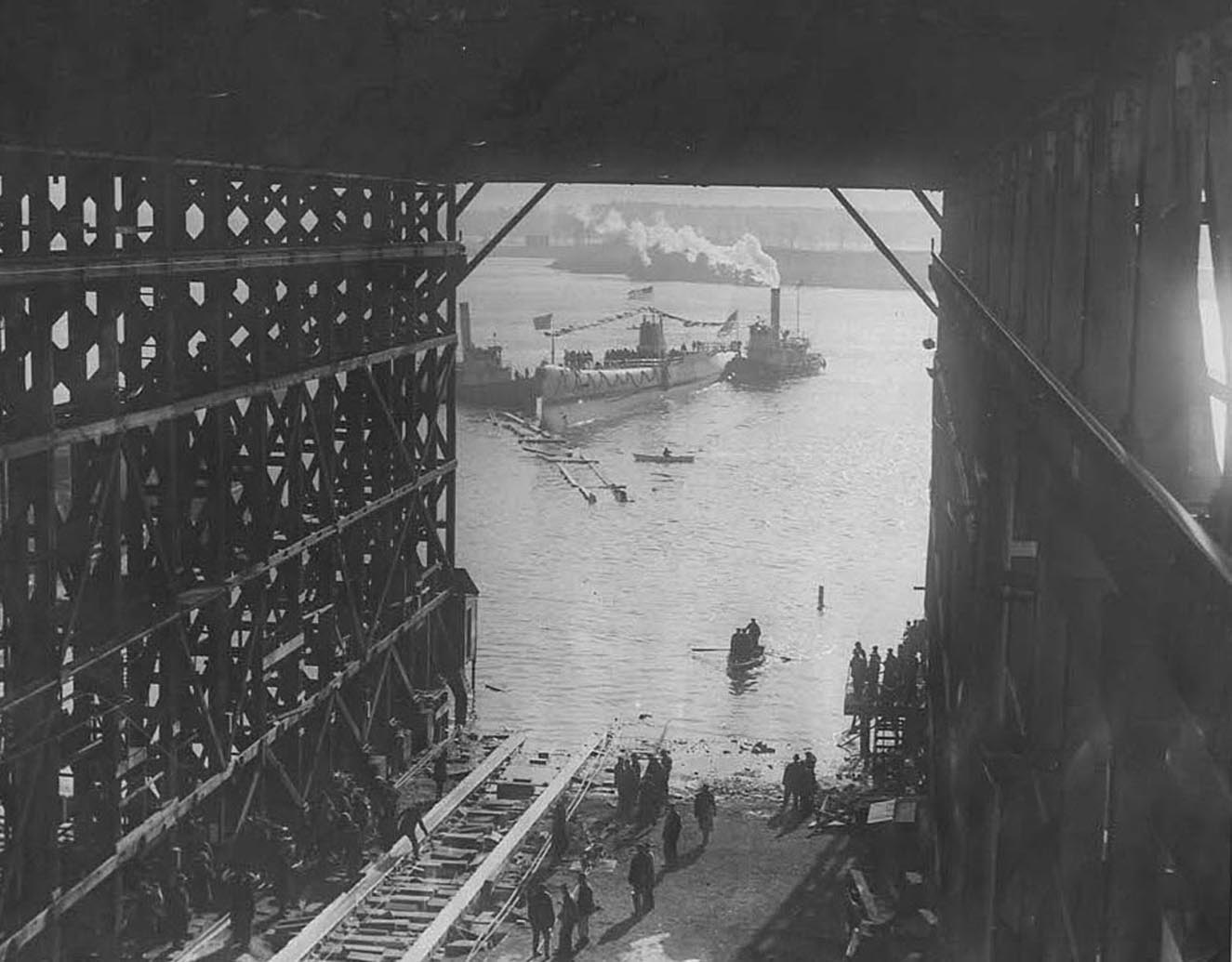 1.27k | LARGEST NAVY DIVER-TAKES THE WATER. The V-2 (SS-164) the largest submarine ever constructed for the United Stales Navy, has been launched at Portsmouth. N. IL, Saturday. Mrs. Douglas Dismukes served as sponsor for the submarine, which will be tested in the Atlantic. |
