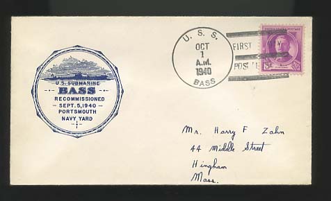 32k | Commemorative postal cover marking Bass's (SS-164) recommissioning, 5 September 1940, at Portsmouth, NH. | Courtesy of Jack Treutle (of blessed memory). | |