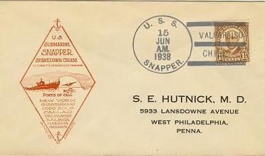 14k | Commemorative postal cover on the occasion of Snapper's (SS-185) shakedown cruise, 15 June 1938. | Courtesy of Jack Treutle (of blessed memory). | |