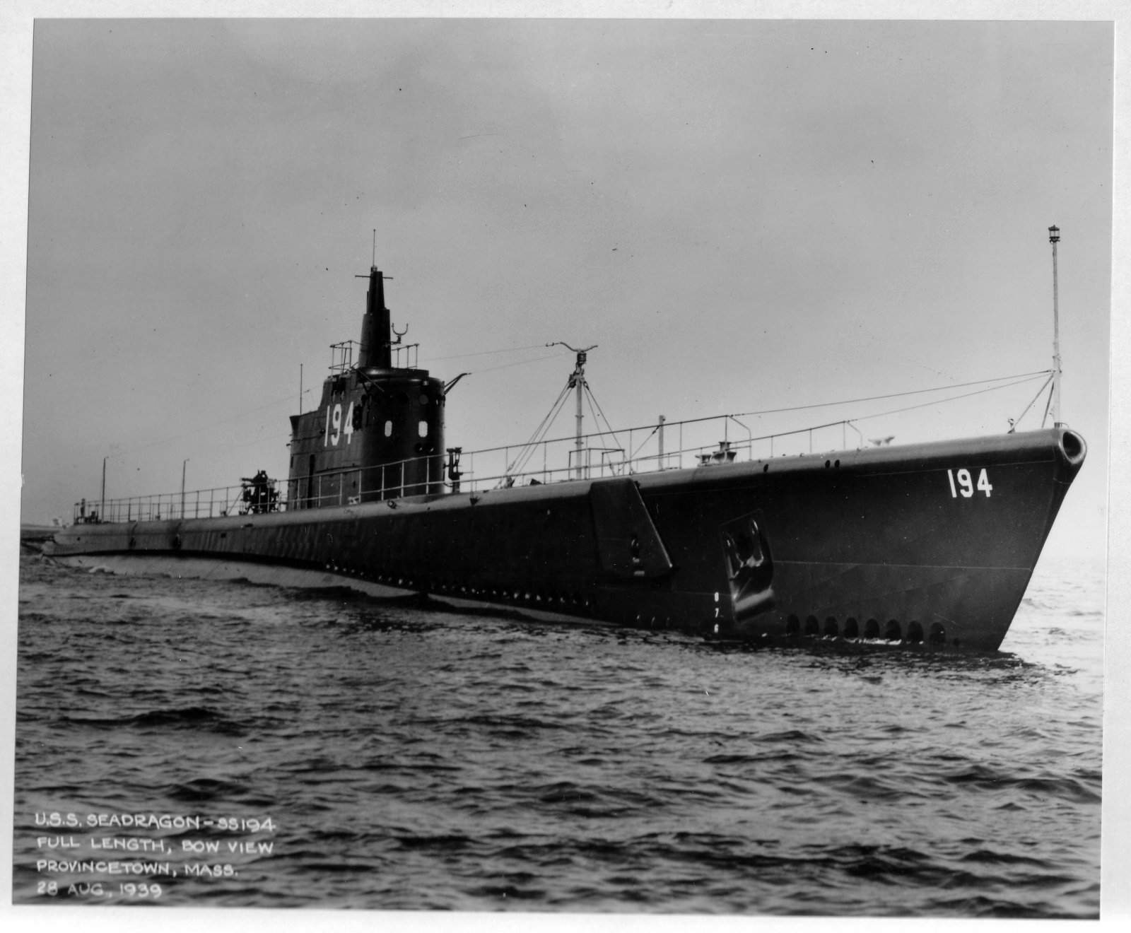 ![]() | 132k | Seadragon (SS-194) full length, bow view at Provincetown, Mass, 28 August 1939. | USN photo # 19-N-20953, from the National Archives and Records Administration (NARA), courtesy of Daniel Dunham. | |