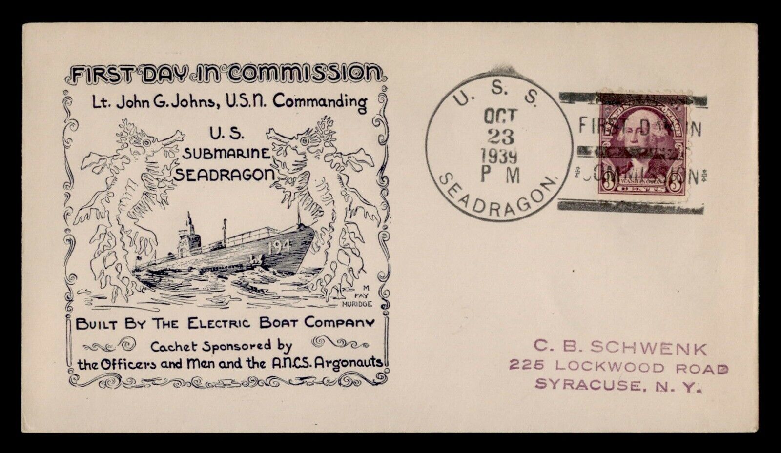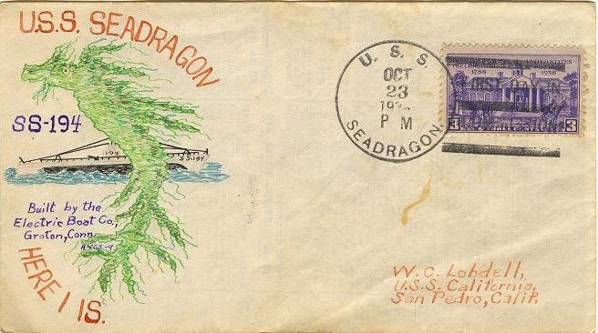 ![]() | 196k | Commemorative postal cover marking the first day of postal service on the Seadragon (SS-194) on her commissioning day, 23 October 1939. | Courtesy of Tommy Trampp. | |