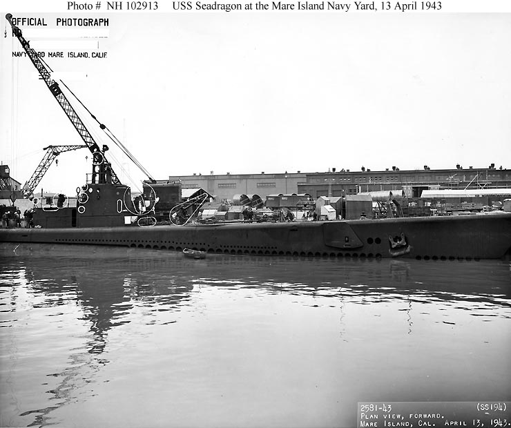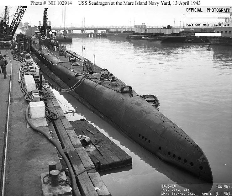 ![]() | 63k | Seadragon (SS-194) off the Hunters Point Navy Yard, San Francisco, California, 24 May 1945. | Official USN photo # NH 102920, from the collections of the Naval Historical Center. | |