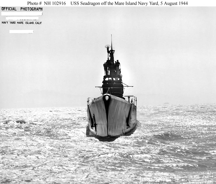 ![]() | 88k | Seadragon (SS-194) seen from almost directly ahead, while off the Mare Island Navy Yard, California, 5 August 1944. | Official USN photo # NH 102916, from the collections of the Naval Historical Center. | |