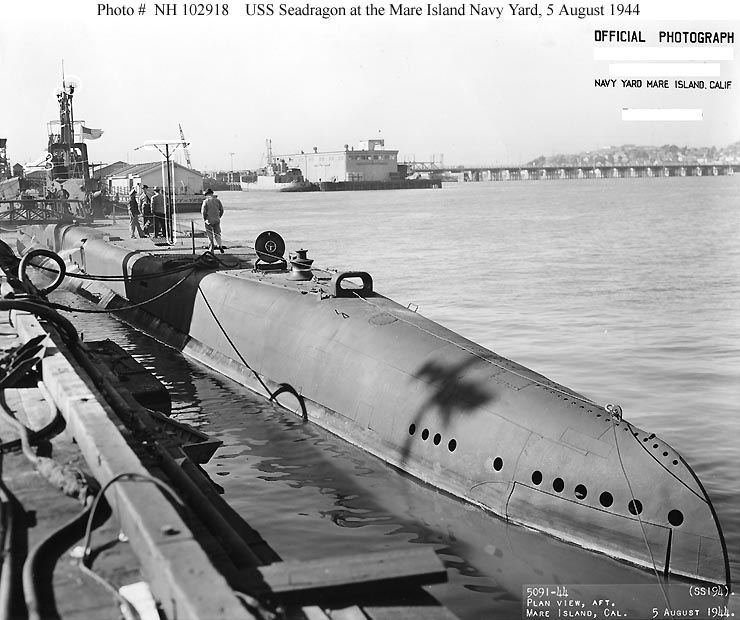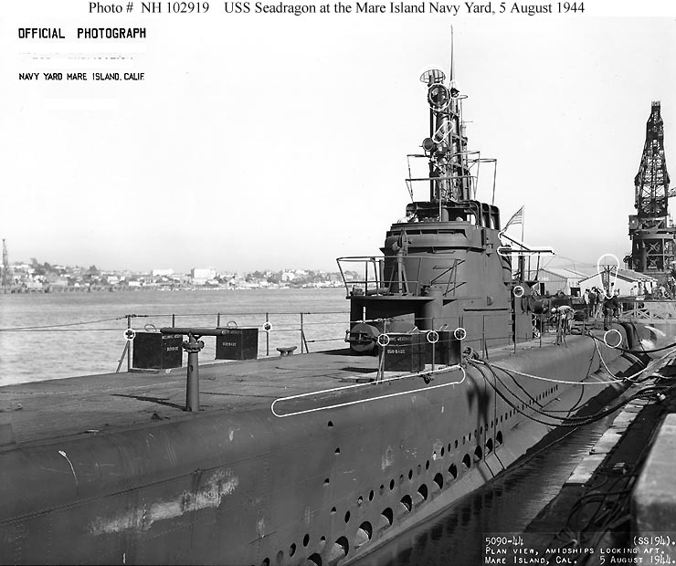 ![]() | 91k | Plan view, aft, of the Seadragon (SS-194) at Mare Island Navy Yard, California, 5 August 1944. | Official USN photo # NH 102918, from the collections of the Naval Historical Center. | |