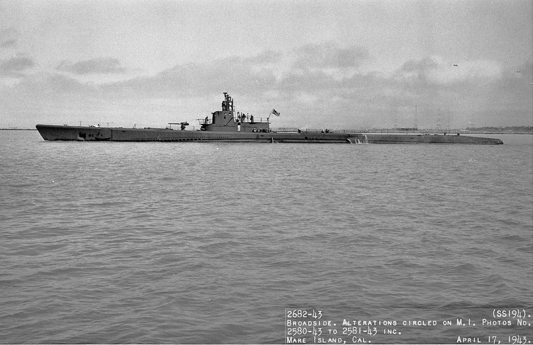 ![]() | 262k | The Seadragon (SS-194) off Mare Island on 17 April 1943. | USN photo # 2682-43, courtesy of Darryl L. Baker. | |