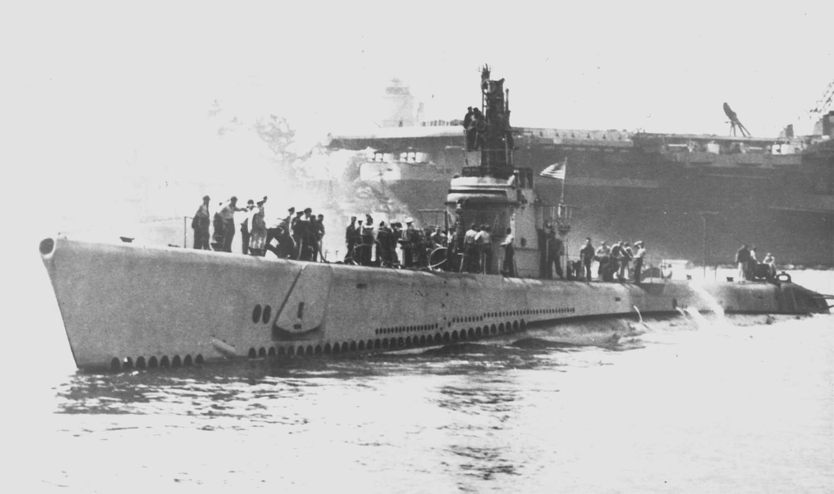 ![]() | 84k | Passing the stern of an unidentified aircraft carrier, the Seadragon's(SS-194) flag fluters in the breeze in this undated photo. | USN photo courtesy of David Buell. | |