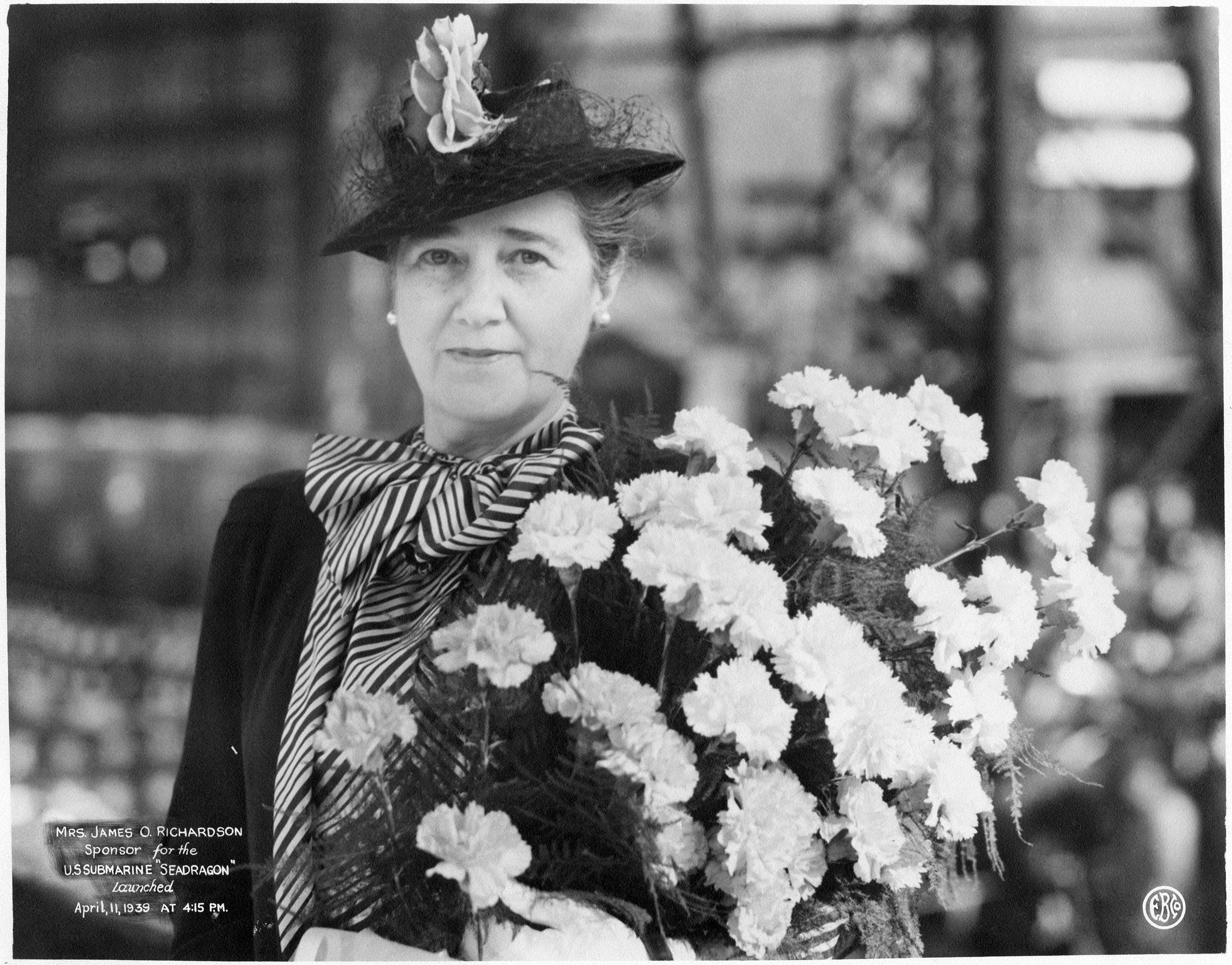 ![]() | 2.43k | Seadragon's (SS-194) Sponsor, Mrs. James O. Richardson, poses with the sponsor's bouquet during christening ceremonies at the Electric Boat Company shipyard, Groton, Connecticut on 11 April 1939. | Photo # NH 54887 by the Electric Boat Company via history.navy.mil courtesy of Chuck Haberlein. | |