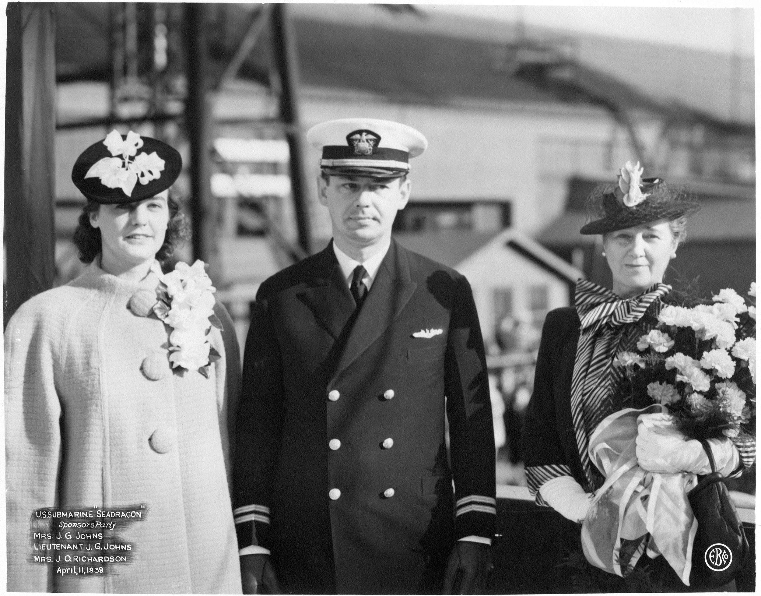 ![]() | 2.34k | Seadragon's (SS-194) Sponsor's party: Mrs. J.G. Jones & Lieutenant J.G. Jones & Mrs. James O. Richardson, during christening ceremonies at the Electric Boat Company shipyard, Groton, Connecticut on 11 April 1939. | Photo # NH 48704 by the Electric Boat Company via history.navy.mil courtesy of Chuck Haberlein. | |