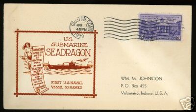 ![]() | 20k | Commemorative postal cover marking the Seadragon's (SS-194) launching, 11 April 1939, at Electric Boat Co., Groton, CT. | Courtesy of Jack Treutle (of blessed memory). | |